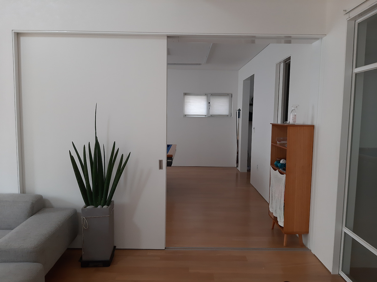 사진 오른쪽에 조금 보이는 유리문이 현관 중문입니다. 이 현관 중문을 열고 들어오면 오른쪽에 당구장이 있습니다. 당구장문은 미닫이 문 두 짝으로 사진에서는 한 짝이 닫혀있는 모습입니다. 다 열면 거실과 연결되는 느낌입니다.