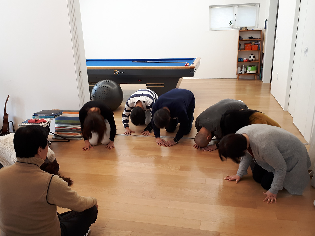 설날에 세배하는 사진입니다. 미닫이 문을 다 열면 이렇게 당구대가 보입니다. 거실 공간이 넓지 않아서 당구장안으로 들어가서 절을 하는 중입니다. 필요할 때는 이렇게 거실공간으로 빌려와서 사용합니다.