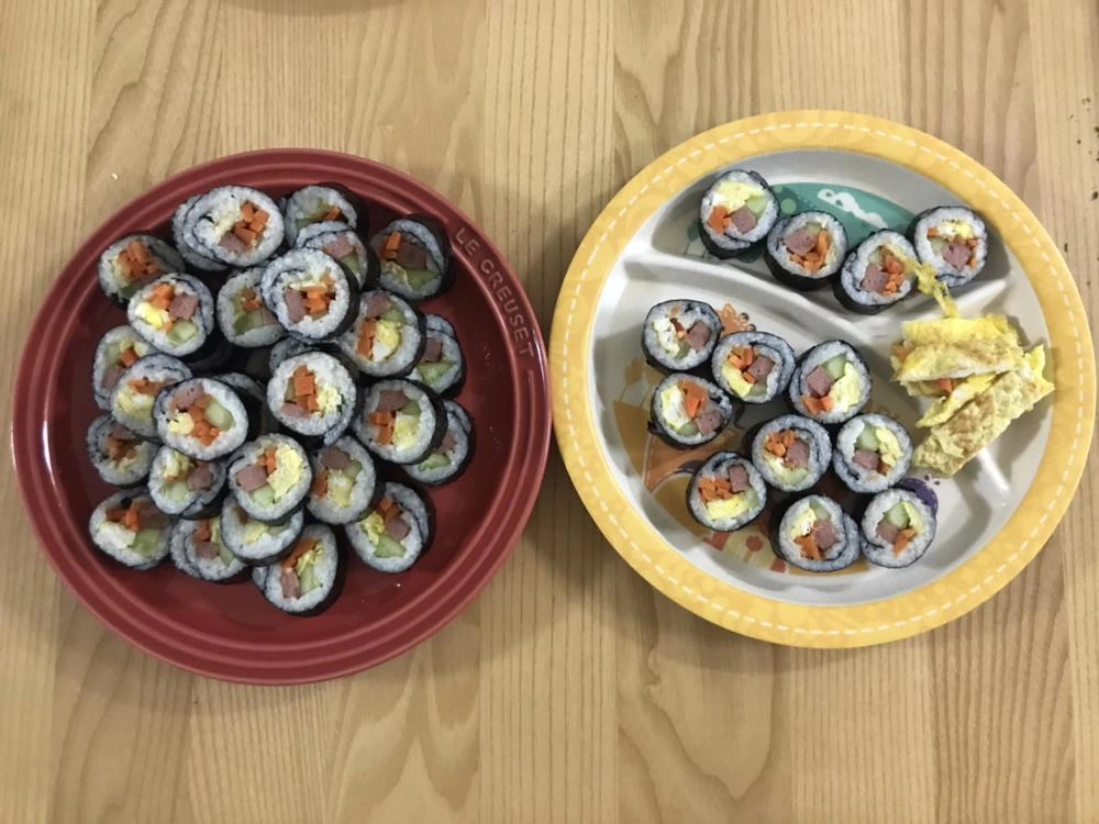 요즘 효자메뉴는 김밥이다. 일단 여섯 살 아들이 좋아하고 잘 먹는다. 그리고 낮에 잔뜩 해두면 밤에 남편이 퇴근해서 먹기에도 좋다. 게다가 한 접시는 냉장 보관해두고 다음 날 계란물 입혀서 살짝 구우면 갓 만든 김밥처럼 맛있게 먹을 수 있다. 무려 세끼를 해결할 수 있다. 처음엔 손이 많이 가고, 양을 가늠하기 힘들어서 기껏 고생만 하고 한 끼 먹기에도 부족했다. 그런데 몇 번 하다 보니 양 조절도 잘되고, 밥하는 것부터 접시에 옮겨 담아 두는 것까지 1시간이면 충분하다.