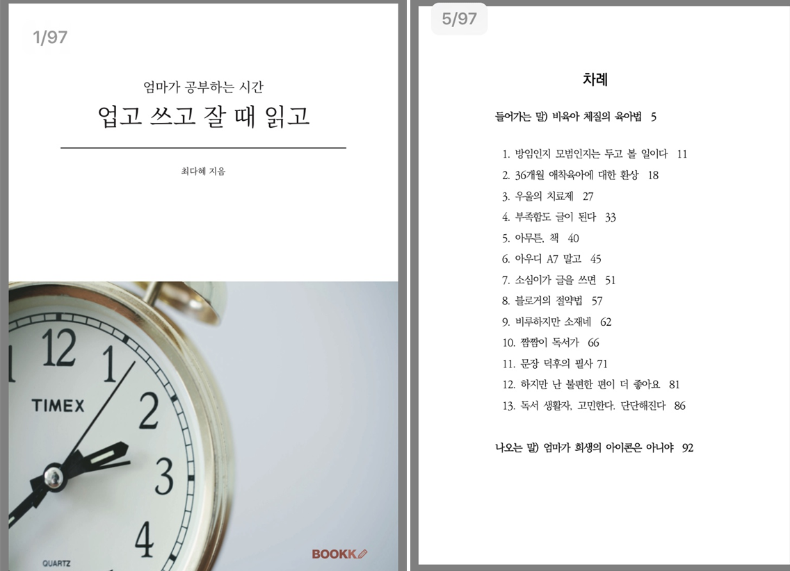 그런 의미에서 유튜브 프리미엄을 해지했다. 그리고 그날 밤, 처음으로 전자책을 구입했다. 우연히 브런치에서 글을 읽고선 애독자를 자처하게 된 최다혜 작가님이 자가출판 플랫폼 부크크에서 <업고 쓰고 잘 때 읽고>라는 책을 냈다는 소식을 들었기 때문이다.