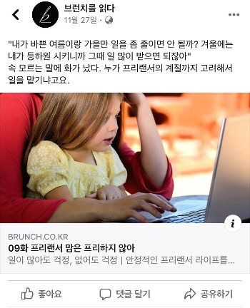특정 글만 공유가 많이 이뤄져 궁금해서 통계를 보니 페이스북이었다. 브런치가 운영하는 페이스북 페이지 <브런치를 읽다>에 들어가 보니 내 글이 소개되고 있었다.