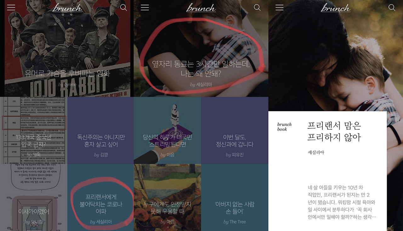 브런치를 켰을 때 내 글이 있으면 반가운데, 이렇게 동시에 세 개나 소개되고 있을 땐 괜히 뿌듯하기도 했다.