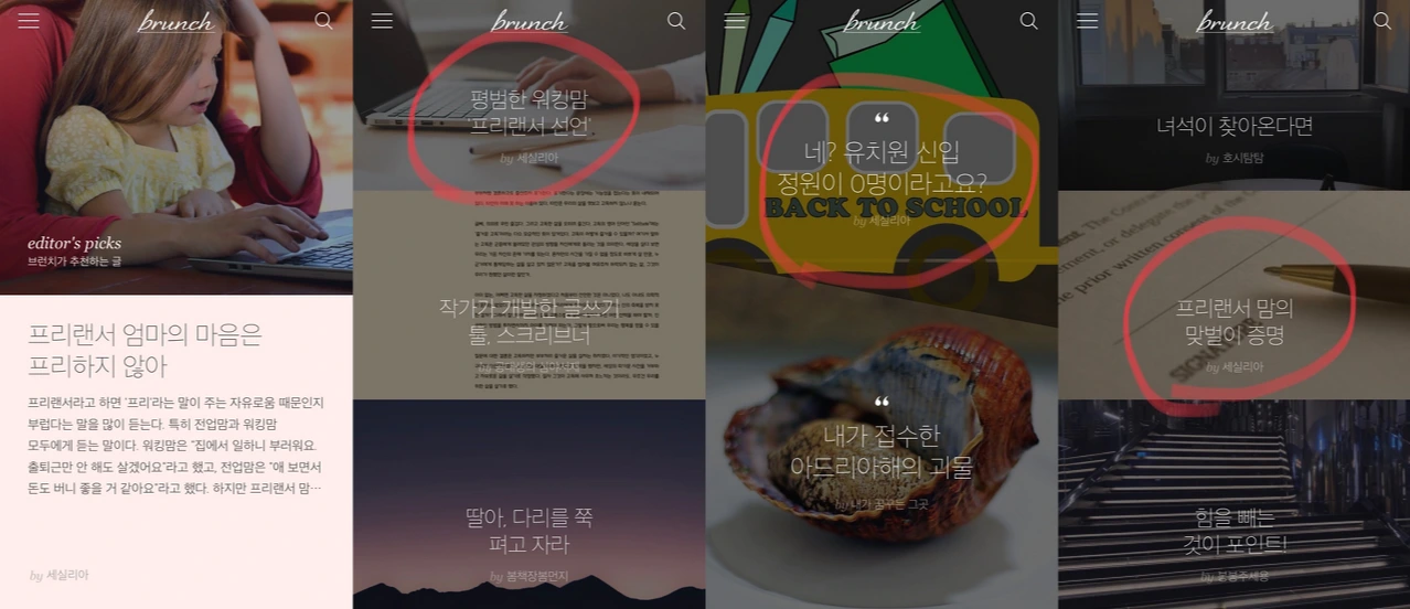 위 캡처본에서 가장 왼쪽은 editor's pick인데, 내 원래 글 제목은 '프리랜서 맘은 프리하지 않아'였는데, 제목이 '프리랜서 엄마의 마음은 프리하지 않아'라고 수정되어있다. 그리고 본문 중 중요하다고 생각되는 내용을 요악해 함께 노출하는 걸 보면 읽어보고 큐레이션 한다는 걸 알 수 있다.