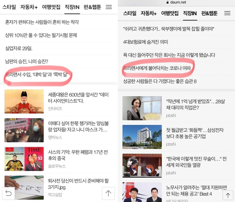 처음 브런치를 시작하고 조회수가 갑자기 폭등할 때가 있었는데, 통계를 보면 DAUM 이라고만 뜨니 도대체 어디서 소개되는 건지 알 수가 없었다. 최근엔 궁금해져서 DAUM에서 찾아보니, '프리랜서'를 주제로 쓴 글이라 '직장in' 카테고리에 글이 소개되고 있었다.