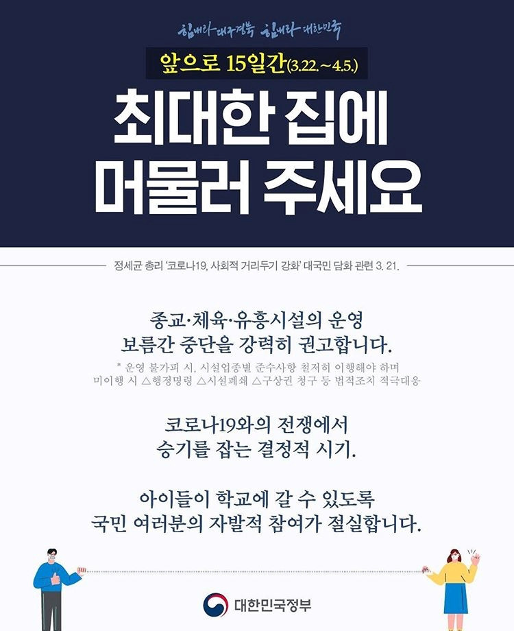 어제 아침 한강에서 자전거 타는 시간이 정말 행복했는데, 저녁에 알림이 왔다. 정세균 총리가 대국민 담화에서 "앞으로 15일간 최대한 집에 머물러달라"라고 권고했다는 내용이었다.
