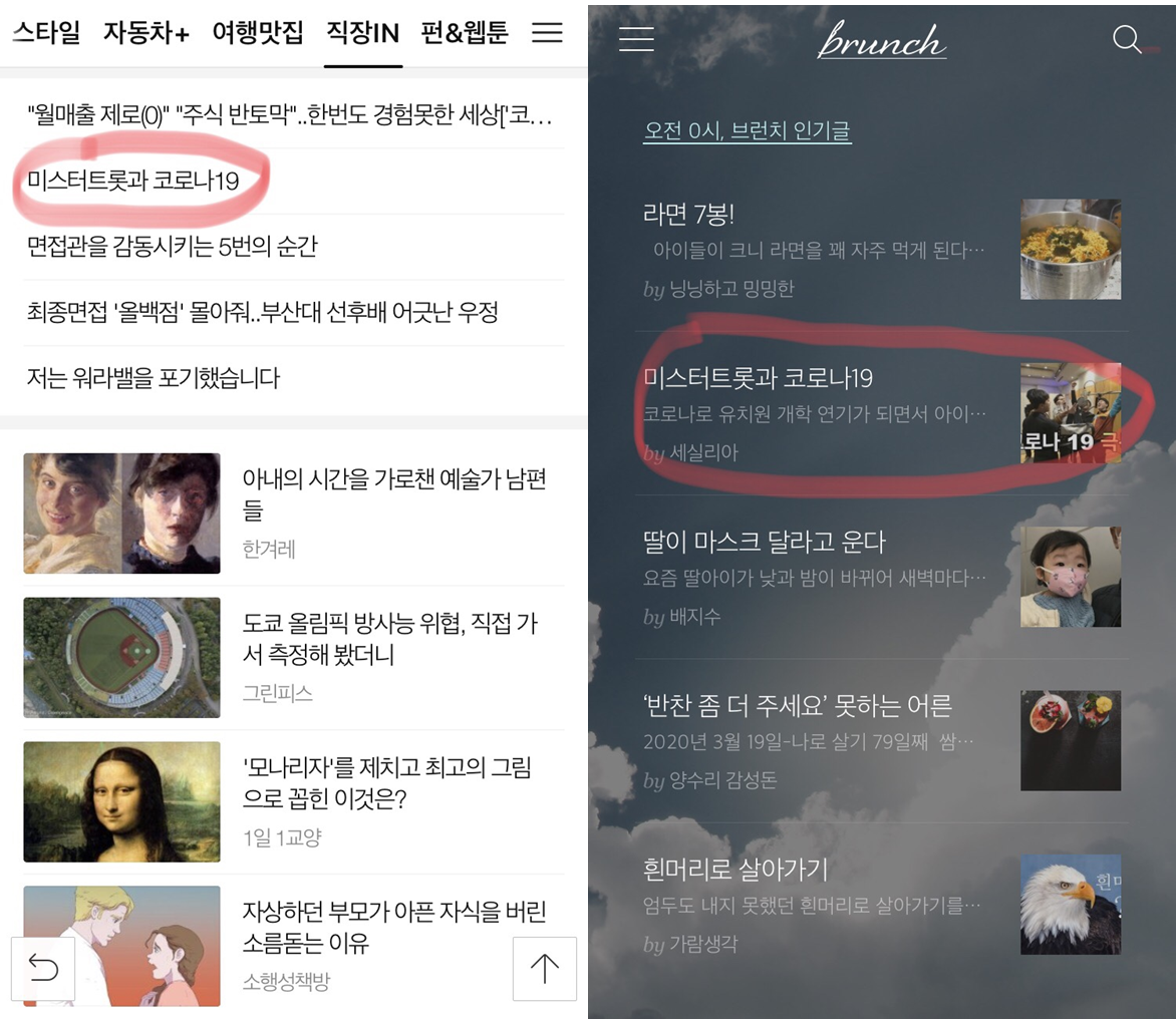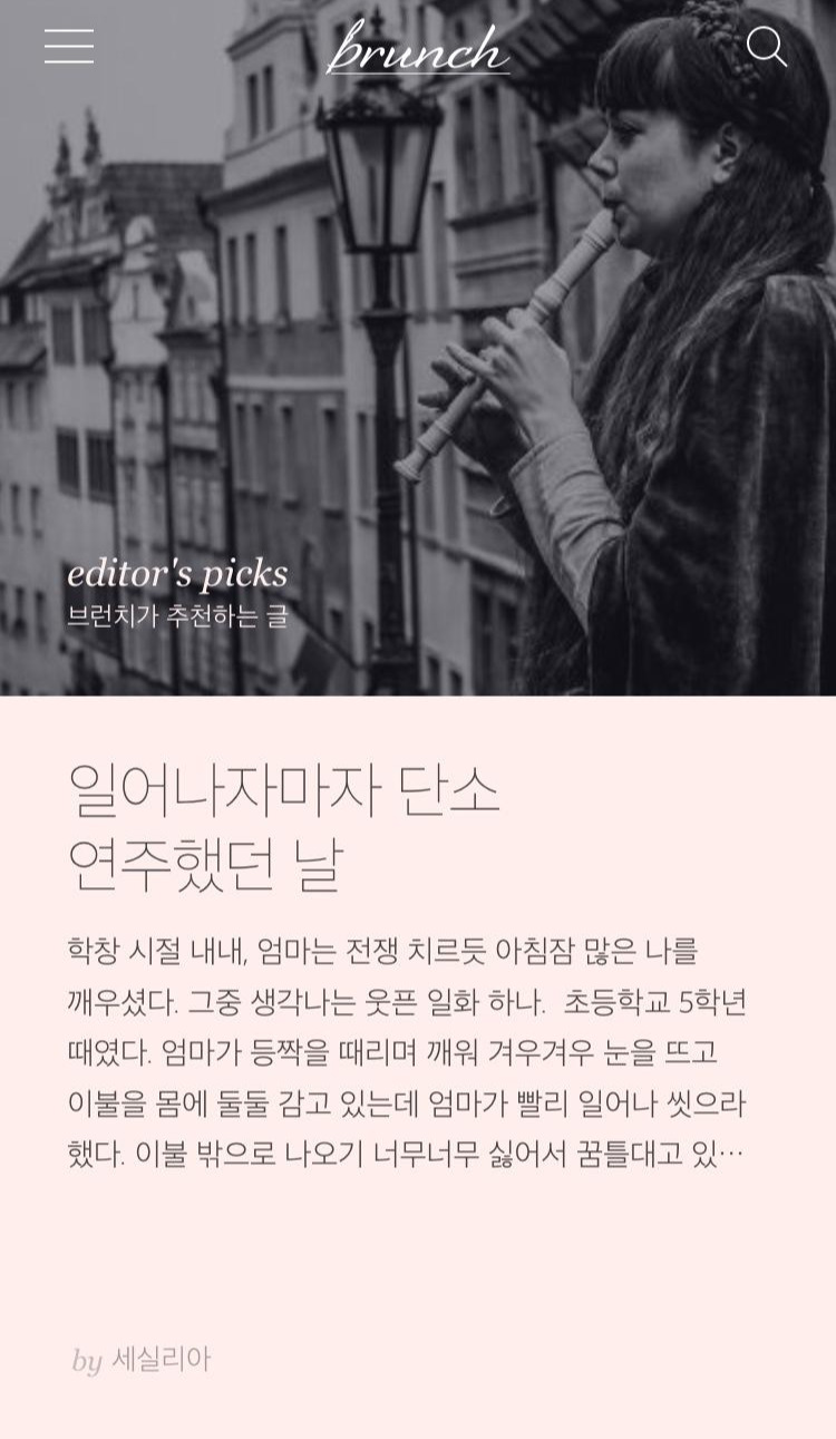 최근 올렸던 글 중 <아빠가 머리 빗겨주던 날들>과 <일어나자마자 단소 연주했던 날>은 브런치가 추천하는 글에 소개되었고, <미스터트롯과 코로나>는 DAUM 메인에 올라가서 비교해봤다.