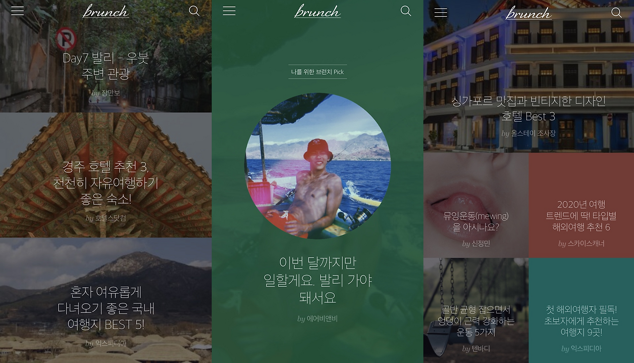 그리고 다음 날 '아이와 발리 한 달 살기'에 갑자기 관심이 생겨 관련 콘텐츠를 많이 찾아봤다. 그랬더니 그다음부터 브런치 앱은 다음과 같이 보였다. 여태껏 경험한 적 없는 메인이었다.