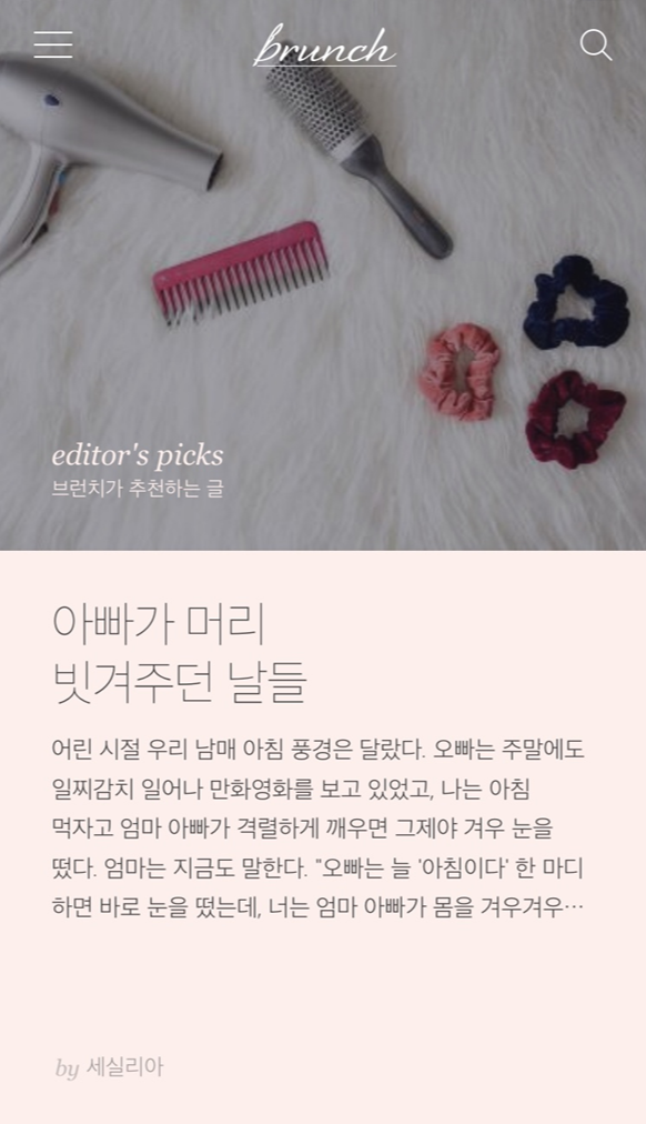 최근에 브런치 메인엔 '브런치 메인 큐레이션에 대한 의문'이 종종 올라왔다. 매번 비슷한 글만 소개되는 메인 글이 지겹다는 글이었다.