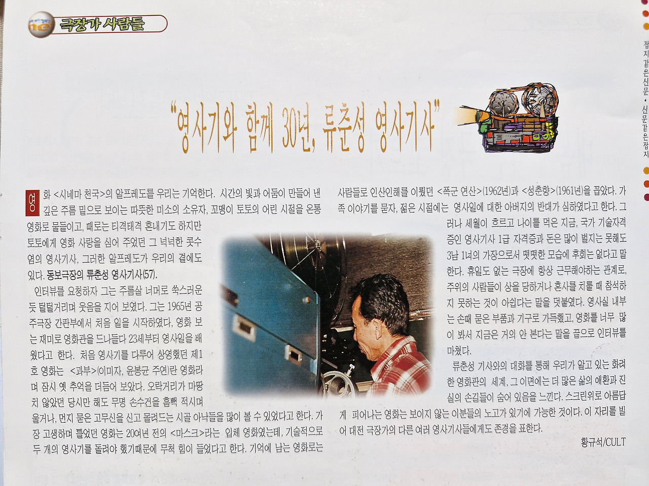 저는 극장가 사람들이란 코너를 만들어서 평소에도 관심이 있었던 극장 간판과 영사실에 대한 취재를 나갔습니다. 역시 <킹덤> 상영으로 안면을 튼 아카데미 극장과 동보극장을 찾았습니다. 그러나 처음부터 쉽지는 않았습니다. 그쪽 분들은 좀 폐쇄적인 부분 고집스러운 부분이 있었습니다. 자신의 공간이나 작업실에 쉽게 발을 들여놓게 하지 않았습니다. 친근하게 인사를 여러 번 드리고 편안한 분위기를 만들기 위해 노력을 했습니다. 공교롭게도 이제 27년이 지나고 나니 두 개의 직업은 사라진 직업이 되어버렸네요. 지금도 건강히 살아계셨으면 못다 한 이야기를 하고 싶습니다. 원래 취재 원고는 많았는데 아쉽게도 편집이 되어서 짧은 내용만 실려서 아쉽네요.