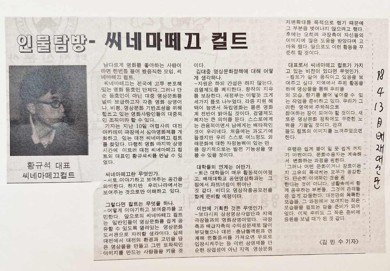 「킹덤」을 대전에서 상영하고 싶다고 영화사에 전화했어요. 영화사에서 나서주었고, 지역 극장들도 받아줘 유치하게 됐습니다. 좋은 영화들이 대전을 비켜가는 것이 아쉽습니다.』 영화 「킹덤」의 대전 유치에 앞장선 시네마떼끄 컬트의 황규석 대표(30)는 『대전이 영상문화의 불모지로 각인된 현실이 안타깝다』고 말했다.