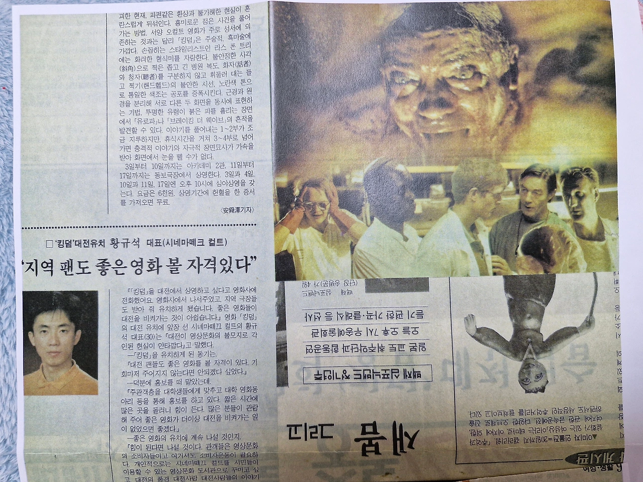 3. 영화의 홍보를 책임지기도 했으니 각 일간지에 보도 자료를 보내고 문화, 영화 담당 기자님께 전화를 넣고 찾아갔다. 대전에서는 제일 오래된 신문인 중도일보의 안순택 기자님의 적극적으로 취지에 공감하셔서 크게 내주셨다. 그리고 당시의 각종 무료 정보지에도 팩스를 보내고 홍보를 했다. 그리고 차량(!) 광고도 했다. 빌린 지인의 티코 차에 킹덤 포스터를 덕지덕지 붙이고 대학가를 돌아다니고 게시판에 포스터를 붙인 것이다. 정말이지 처절하리만큼 밥을 굶어가며 홍보를 했다. 그냥 즐거웠다. 이 프로젝트가 성공해야 컬트도 살고 또 다음에 좋은 영화가 오면 걸릴 수 있다는 희망을 줄 것이기 때문이었다. 지금도 그렇지만 그렇게 고생하는데 밥 한 끼 제대로 사주지 못한 게 못내 아쉽고 미안하다. 여하튼 극장에 영화가 걸리고 정말 사람들이 미어터졌다. 왜 그런가 생각해 보니 국제영화제에서나 가능한 일이 대전에서 펼쳐지고 있었으니까 신이 날만도 했을 것이다. 밤을 새워 졸음을 쫓아가며 영화를 보는 일. 극장에서 나와 뜨는 해를 바라보는 일이야말로 진짜 영화광의 자격이 아닐까 생각되었으니까 말이다. 불과 4개월 전 열린 영화제에서도 느꼈지만 막 국제영화제가 생기고 각종 영화잡지들이 영화를 읽어보는 재미를 만들었다. 불확실과 경기 침체 IMF 시대를 이겨내는 방법은 검은 장막을 치고 들어가 잠시 현실을 잊거나 현실을 투영한 영화에 자신을 얹혀놓는 방법을 찾았기 때문이 아니었을까 싶다.