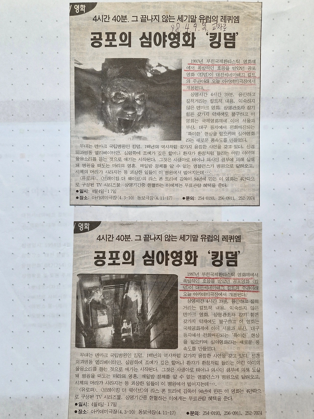 1997년 부천 국제 환타스틱 영화제에서 폭발적인 호응을 받았던 공포영화 <킹덤>이 대전 시네마떼크 컬트의 주관아래 오늘 아카데미 극장에서 개봉된다. 상영시간 4시간 39분. 음산하고 질척거리는 컬트적 내용, 익숙하지 않은 덴마크 영화. 상영관조차 잡기 힘든 갖가지 악재에도 불구하고 이 영화는 서울과 부산, 대구 등지에서 전회매진되는 '특이한' 현상을 일으켜 심야영화라는 새로운 풍속도를 만들었다.
