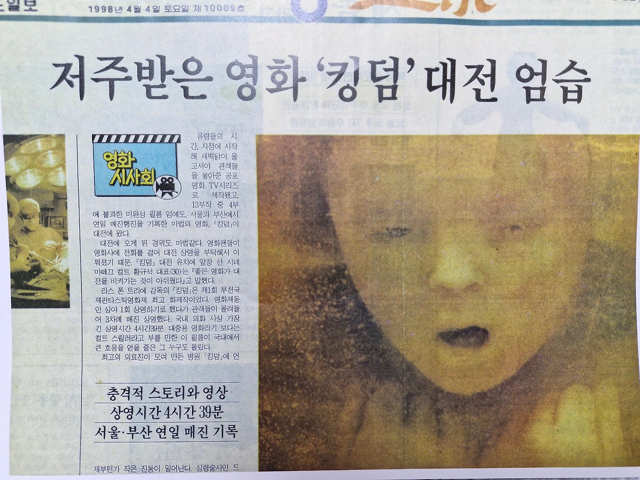 - 유령들의 시간, 자정에 시작해 새벽닭이 울고서야 관객들을 놓아준 공포영화. TV 시리즈로 제작됐고, 13부작 중 4부에 불과한 미완성 필름임에도, 서울과 부산에서 연일 매진행진을 기록한 마법의 영화, <킹덤>이 대전에 왔다. 대전에 오게 된 경위도 마법 같다. 영화팬들이 영화사에 전하를 걸어 대전 상영을 부탁해서 이뤄졌기 때문. <킹덤> 대전 유치에 앞장선 시네마떼끄 컬트의 황규석 대표(30)는 "좋은 영화가 대전을 비켜가는 것이 아쉬웠다"라고 말했다.