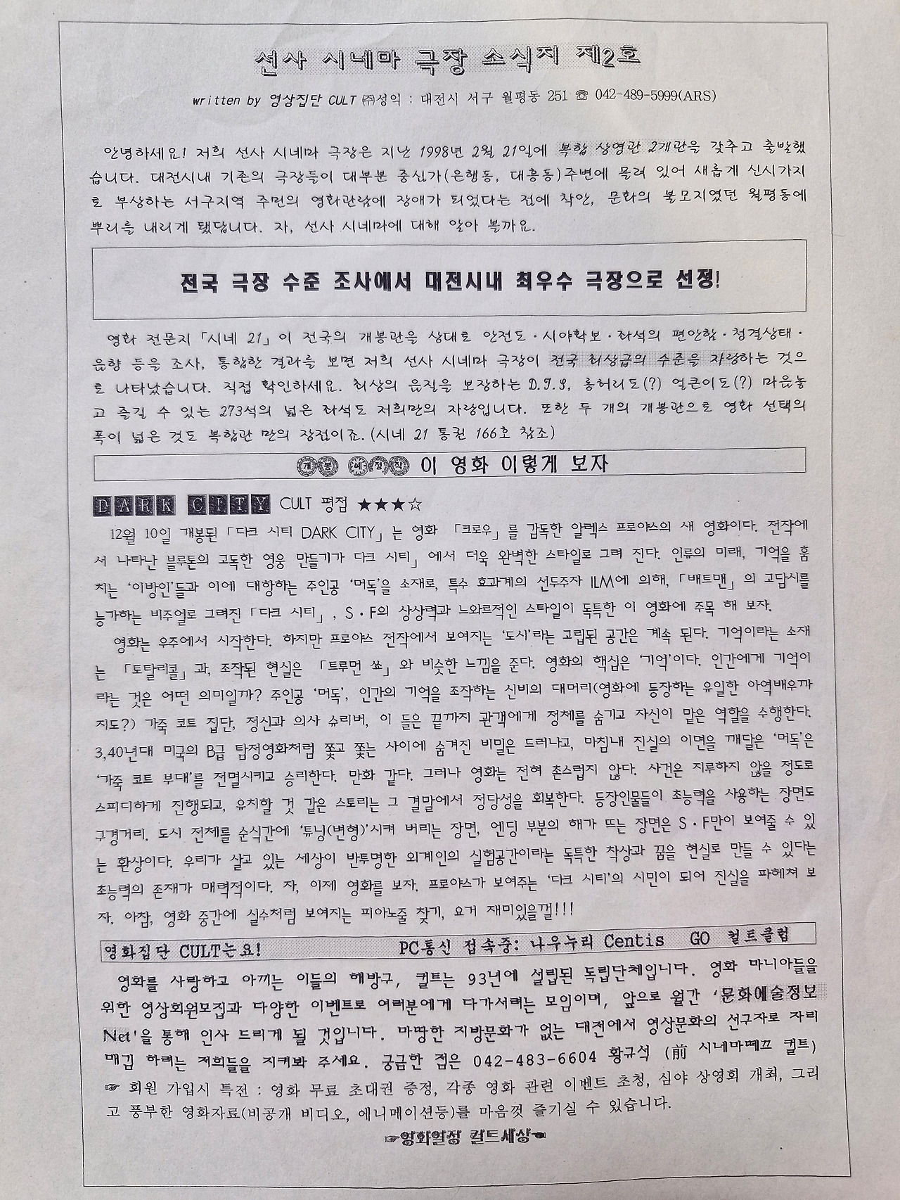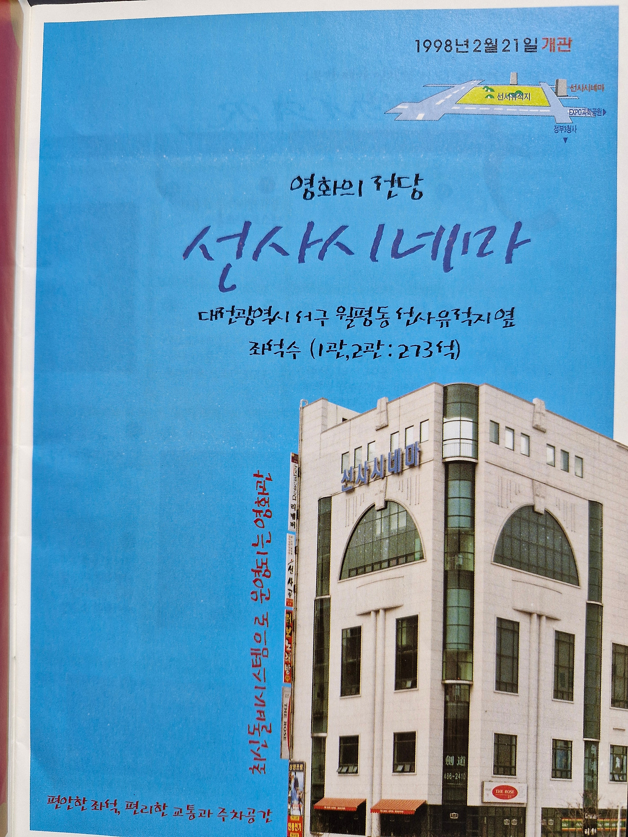 - 그때 둔산동 정부 3 청사 맞은편 그러니까 둔산 신도시에 그해 1998년 2월에 오픈한 2개의 개봉관이 있는 '선사시네마라는 곳을 알게 되었습니다. 사장님이 여성분이셨습니다. 사무실로 쓸 공간을 한다고 찾아가서 면담을 했습니다. 상영실은 없어도 되고 그저 작은 공간 업무를 볼 공간을 구한다고 말했습니다. 보증금도 없고 월세 낼 형편도 안되었습니다. 대신 공간을 확보해 주시면 극장의 일을 나서서 돕겠다고 했습니다. 홍보와 기획일을 말입니다. 그래서 찾은 공간이 엘리베이터 아래 공간입니다. 2평이나 됐을까요. 사방에 책장과 비디오장을 넣었습니다. 다시 또 피 말리는 이삿짐 나르기. 무거운 영화 잡지와 테이프. 어떻게든 공간을 구해야 했으니 그마저도 감사했습니다. 극장을 두 곳을 하는 운영하는 곳이라 영사기사님도 세분이 돌아가면서 일했고 청소 아주머니가 밥을 저 건물 꼭대기에서 해주는데 영사 실장님들 매점 알바 학생, 그리고 포스터 벽보를 붙이는 분과 친해져서 맨 위에서 식사하는데 함께 종종 밥도 얻어먹었습니다.