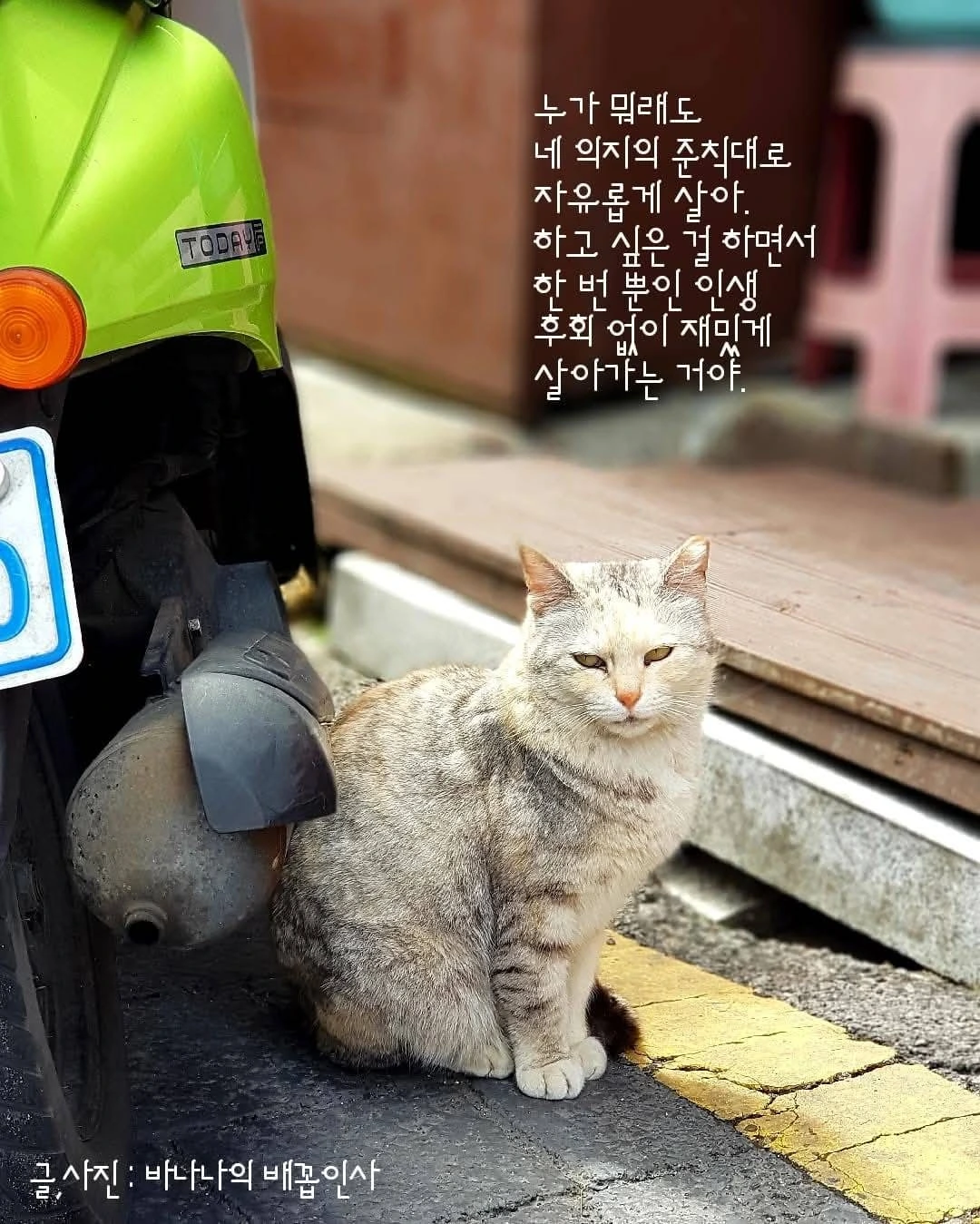 길냥이를 보았다. 예쁘장한 녀석은 내가 인간사회 계급에서 을이란 느낌을 척 보고 알았는지 도망가지 않고 나와 눈을 마주쳤다. "넌 어쩌다가 그렇게 길을 떠돌고 있니?" "아저씨는 어쩌다가 을이 되어 움츠리고 다니니?" 녀석의 피로한 얼굴과 이마부터 목에 주름이 갈수록 깊어지는 나는 그 아이와 동병상련을 느낀다. "힘들지?' "난 괜찮아요, 이것이 내 삶인 걸요 뭐" "아프지 마라, 건강하고...." "네 고마워요, 아저씨도 파이팅!" 짧은 시간 우린 이렇게 대화를 나누었다. 부디 이 아이가 사고 나지 않고 사는 날까지 누구의 구속도 없이 자유롭게 평화롭게 살았으면 하는 마음이다. 한낮의 오수도 즐겨가면서. 누구의 손도 타지 않고 말이다. 자유로운 영혼으로 죽기 전까지...