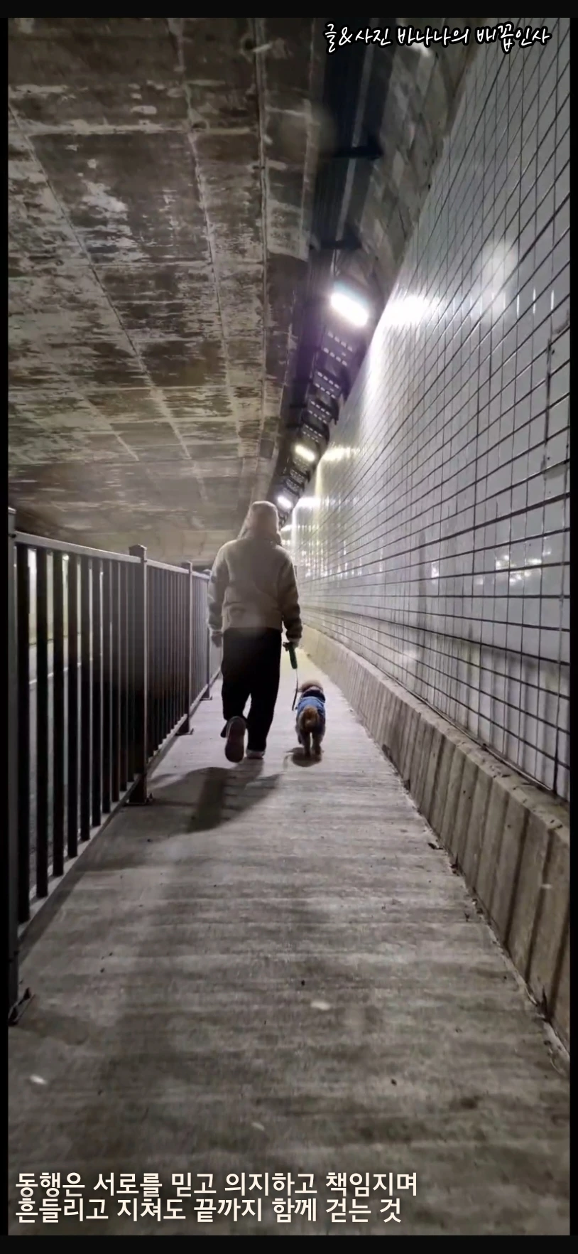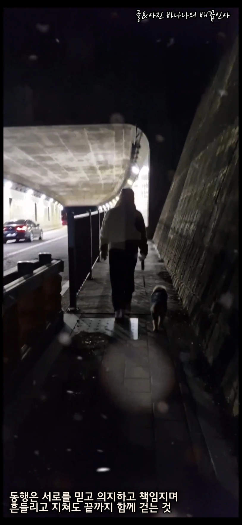 동행! 이 얼마나 든든하고 믿음직한 단어인가... 듣기만 해도 가슴이 뜨거워지는 단어이다. 저녁을 먹은 후 겨울밤 야간 산책을 나가서 이 사진을 찍었다. 어두운 터널을 들어가는 장면과 빛이 있는 터널을 걷는 모습이다.