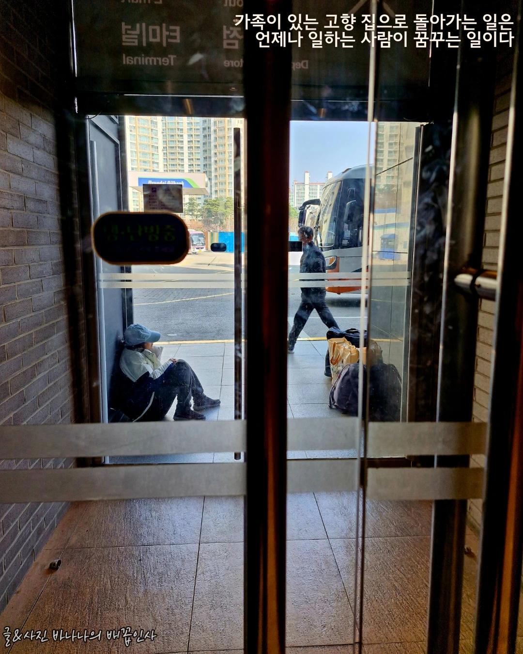 지난 3월의 어느 주말 고향 대전에 가기 위해 잠시 들른 천안 버스 터미널의 모습을 담았다. 버스 승하차 찬 바닥에 쪼그려 앉은 외국인 노동자의 모습. 안쪽에 자리가 있음에도 뭐가 좀 불편한지 버스가 도착하고 출발하는 모습을 보며 조금은 처량하게 앉아있는 모습을 보니 측은하게도 느껴진다. 머나먼 한국에 돈을 벌러 온 그들의 모습은 불안하기도 하고 또 피곤해 보이기도 한다. 말이 서툴러서일까 아니면 가족과 함께 한 다정한 한국인들의 모습을 보면 고향의 가족이 생각나서 일부러 외면한 것일까 하는 생각도 들었다.