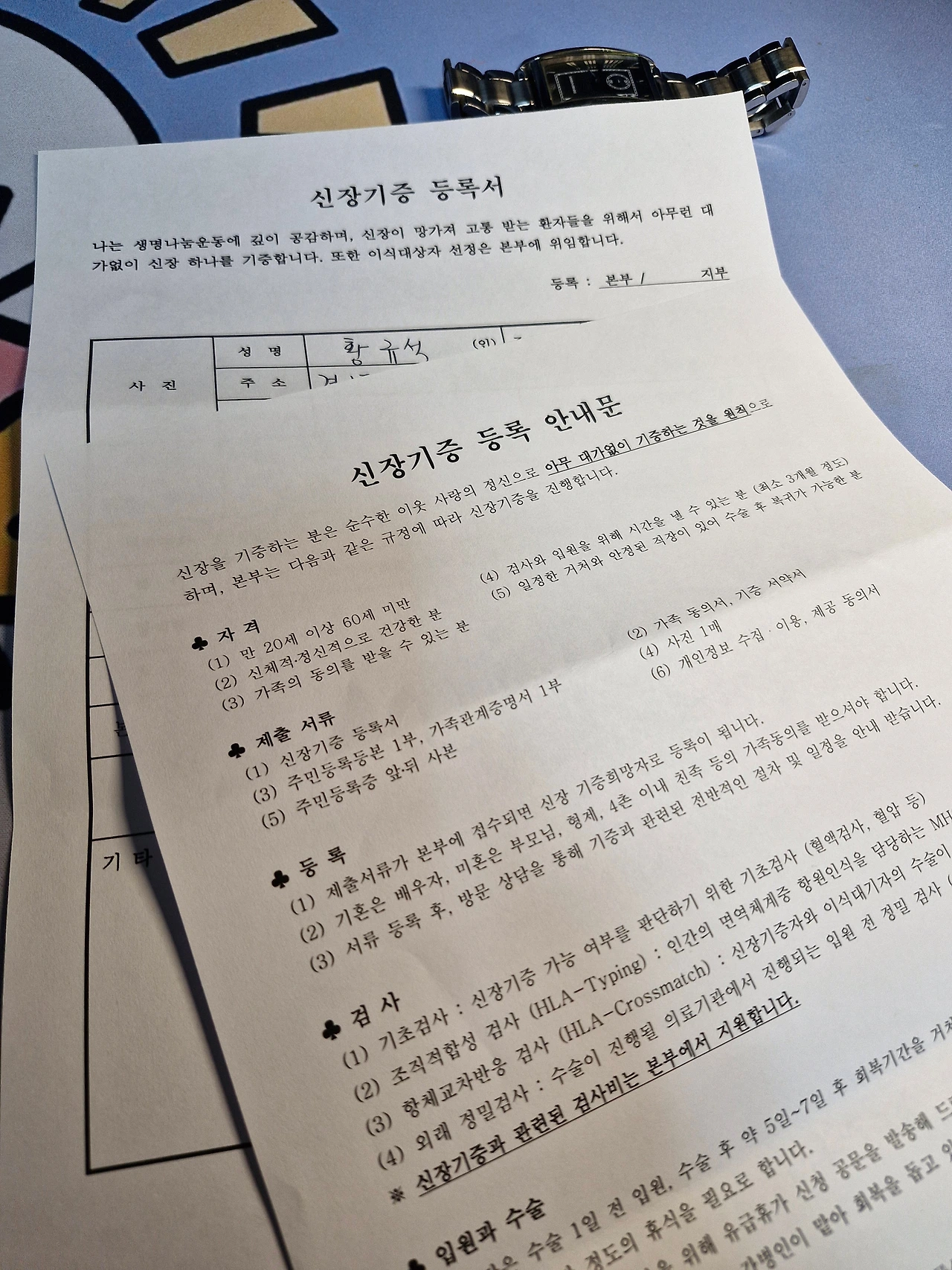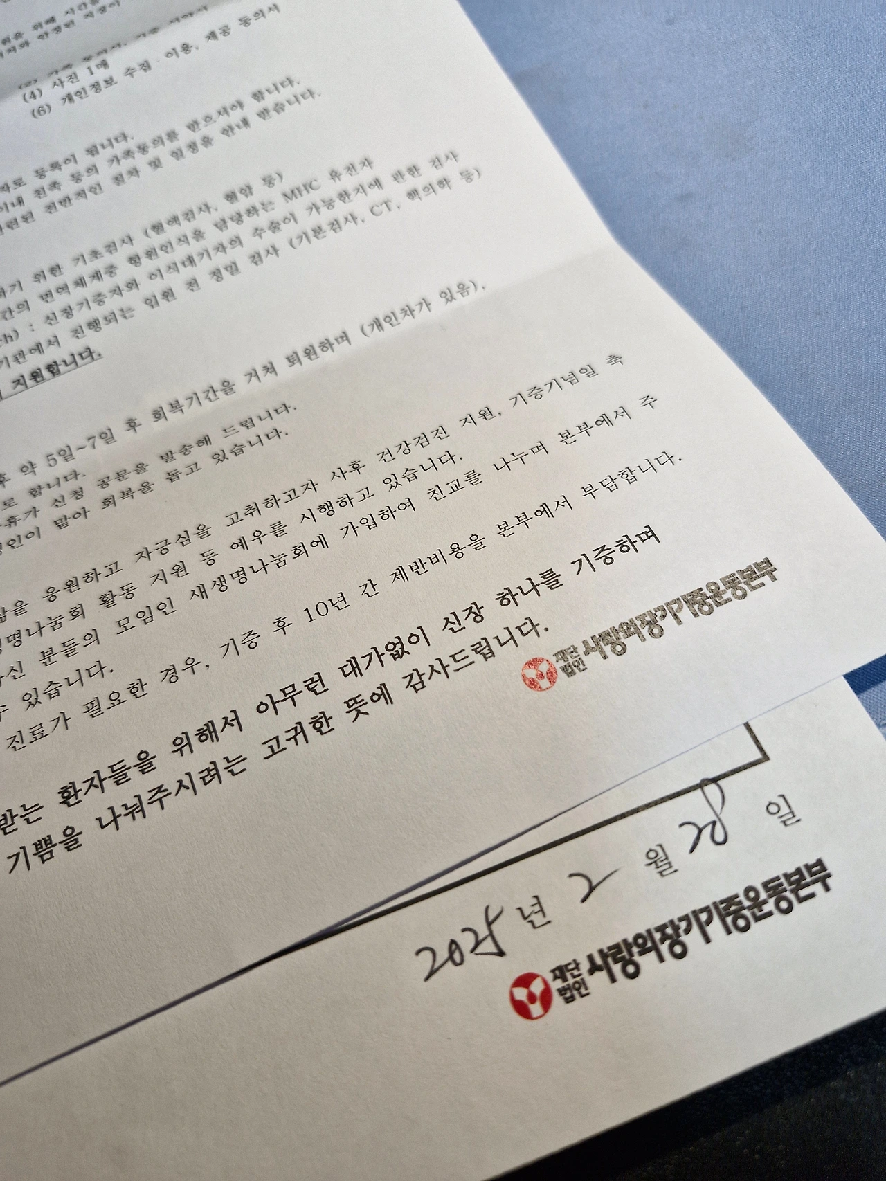 헌혈을 하면서도 뭔가 부족한 느낌이 들었습니다. 그렇습니다. 40년간 너무 반복(!)적인 일이라 사실 좀 지루하게 느껴진다는 것도 사실입니다. 물론 농담입니다. 그래서 오래전부터 생각해 왔던 일을 이제 실행에 옮길 때가 온 것 같습니다. 바로 신장기증을 실행하기로 한 것입니다. 일단 사전조사를 하고 사랑의 장기기증운동본부란 곳에 전화를 했습니다. 아무래도 가장 공신력 있는 기관에서 해야 안전하게 진행을 할 수 있을 것 같아서였습니다. 그래서 통화를 했습니다. 담당 팀장이신 사회복지사님과 매칭이 되어 기본적인 진행절차를 알게 되었습니다. 통화를 통해서 전체적인 과정을 잘 설명받았습니다. 그렇게 설명을 들으니 더 무상 기증에 대한 욕구가 커졌습니다. 그리고 최종 기증자의 동의를 구하고 확인하는 서류를 받았습니다.