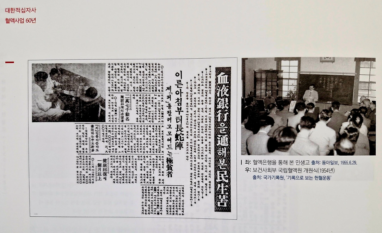 휴전 후 전시와 같이 미국의 공급이 힘들어지자 자체적으로 혈액은행을 설치 하라는 미국의 지원으로 1954년 6월 7일 서울 을지로 입구에 위치한 보건사회부 별관에 국립혈액원이 문을 열었습니다.