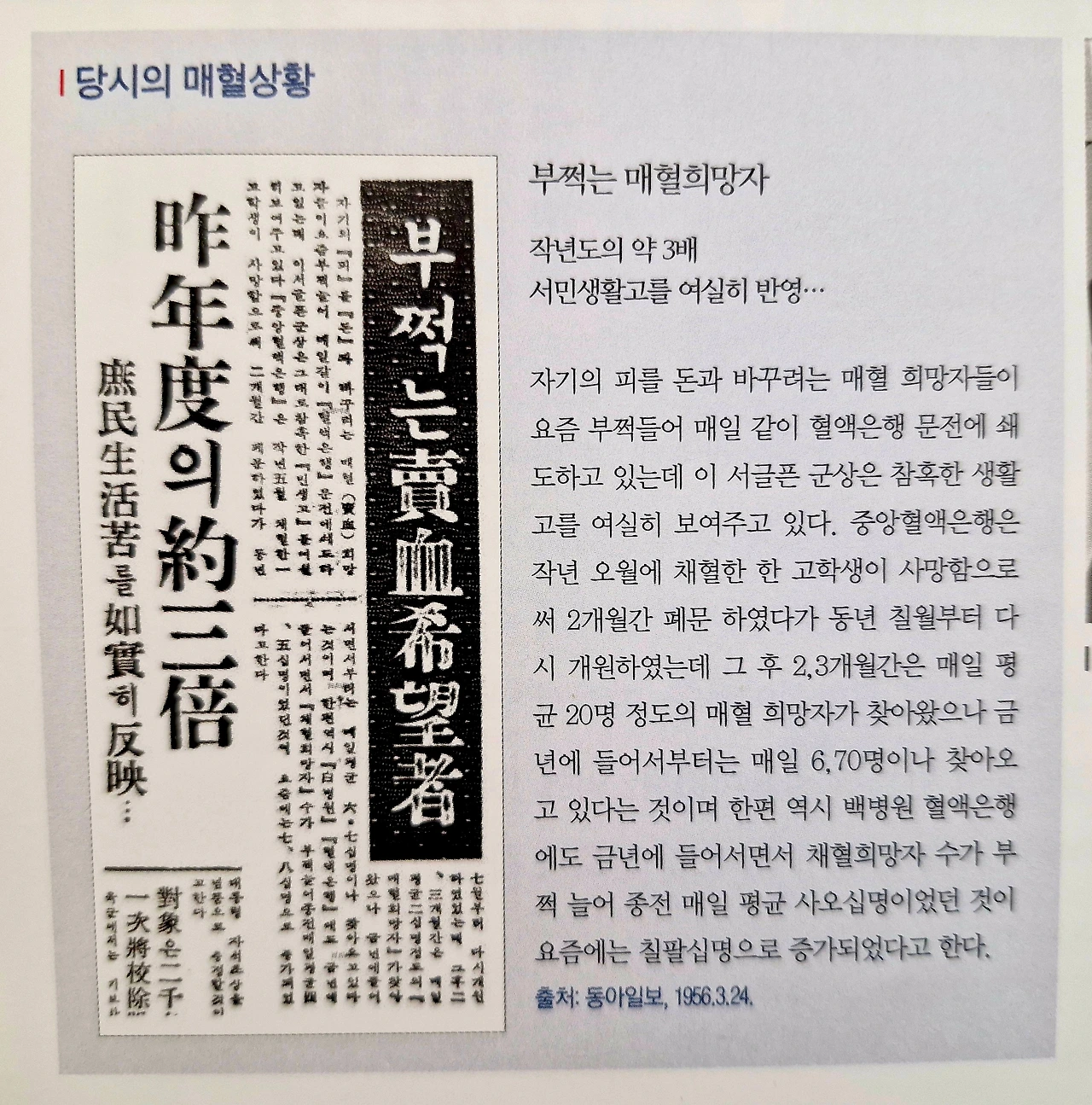 1956년 2월, 학비를 조달하기 위해 국립혈액원에서 매혈을 하고 돌아가던 모 대학교 학생이 갑자기 사망한 사건이 발생했습니다. 당시 언론에서는 반복된 매혈로 인한 만성빈혈을 사인으로 보고 사회문제화하였고 국립혈액원은 큰 곤경에 빠졌습니다.
