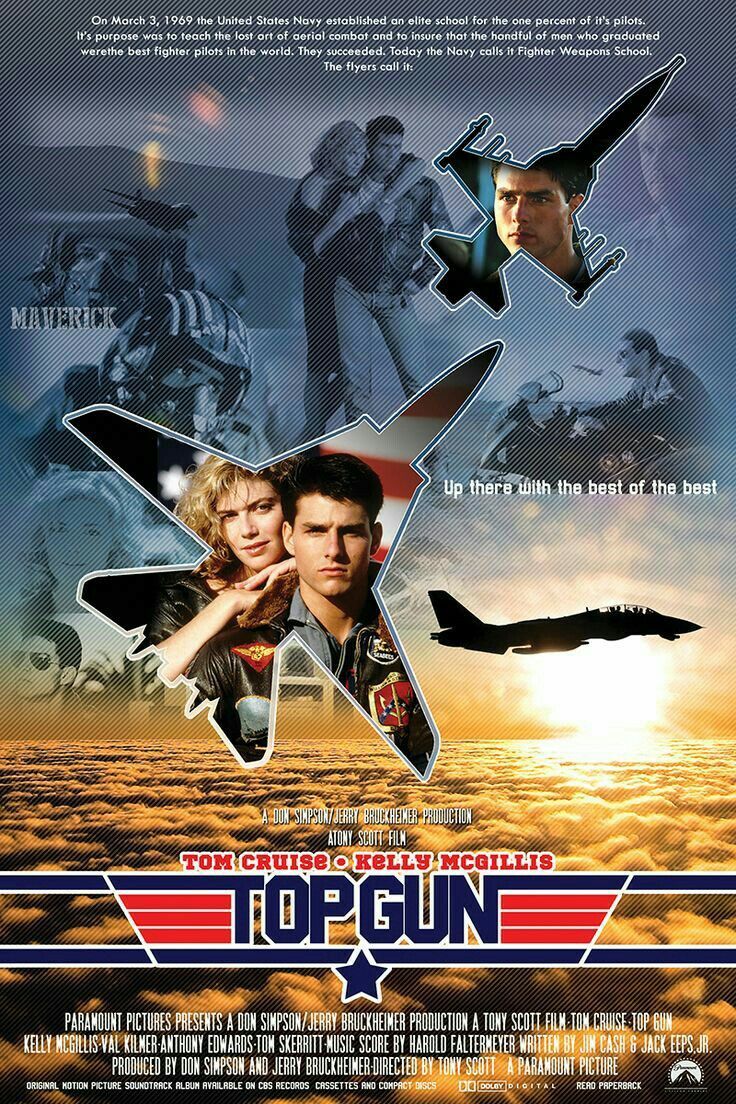 - 미 해군 조종사 중 엘리트만 선발. 세계 수준의 전투기 조종사를 양성하는 학교인 탑건에서 벌어지는 해군 파일럿들의 용기, 사랑, 좌절과 희망을 그린 영화. 1987년 아카데미 음악상 수상. 토니 스콧 감독. 톰 크루주 주연.