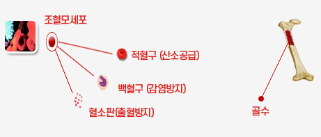 조혈모세포는 모든 혈액세포를 만들어내는 능력을 가진 원조가 되는 어머니 세포를 말하며 혈액을 구성하는 적혈구, 백혈구, 혈소판으로 분화됩니다.