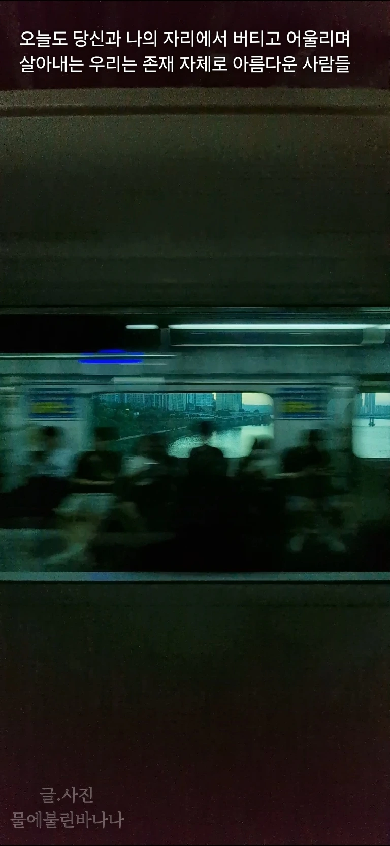 그래서 지금 자신의 위치에서 묵묵히 살아내는 우리 시민 모두가 그렇게 멋지고 대단하게 느껴집니다. 빛이 있으면 어둠이 있듯 아직도 힘든 분들이 많이 있는 것도 잘 압니다. 어려운 천재지변이 나면 언제나 그랬듯 팔을 걷어붙이고 조금 도움의 손길을 내미는 자랑스러운 대한민국의 국민들. 저도 그 이름 없는 국민이고 시민의 한 사람이니까 자랑스럽고 고맙습니다. 그래서 대한민국의 국민으로 태어나서 감사합니다. 부자건 가난하건 능력이 있건 없건 다 각각의 역할이 있을 것입니다. 거기서 포기하지 않고 당당하게 살아나가는 사람들이 있어서 감사합니다. 그래서 아름다운 대한민국, 한강을 건너는 전철 위에서 서서히 지는 저녁놀을 바라봅니다.