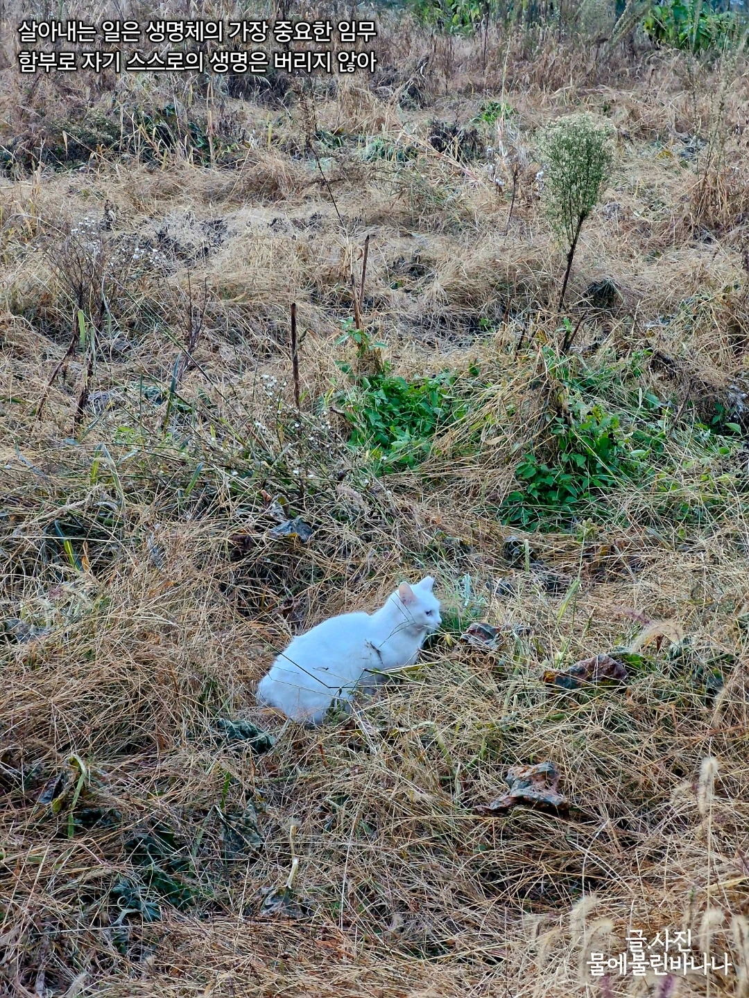 하얀 길냥이를 우연히 보았습니다. 아니 보였습니다. 저는 도시 변두리에 살고 있습니다. 근처에 공터도 있고 텃밭도 볼 수 있습니다. 저 하얀 길냥이가 인기척에 놀라서인지 경계를 하고 있는 모습 같았습니다. 저렇게 예쁜 길냥이가 어찌 집이 없이 혼자 저렇게 잡초가 우거진 풀밭에 있을까요. 보자마자 참 안쓰럽다는 생각을 하게 되었습니다. 어떤 고양이는 주인을 잘 만나서 안전한 곳에서 관심과 사랑을 받도 사는데 저 고양이는 얼마나 힘들게 들판에서의 삶을 영위하고 있을까요. 하루하루를 말입니다. 개를 키우고 있어서 그런지 길냥이 들도 그냥 예사로 보지 못하고 있습니다.