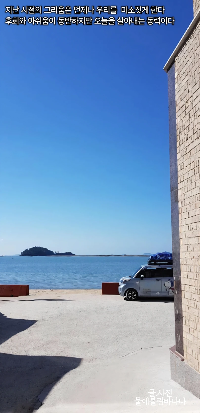 그렇게 힘들었던 추억은 힘든 오늘을 살아내는 힘이 되는 의미인 것 같습니다. 그리고 고생스러웠던 추억이 더 오래 남는 것은 왜일까 생각해 봤습니다. 그것은 그 시절을 함께 견디고 버티고 지나왔다는 공감과 연대감이 충만해서 그런 것이 아닐까 싶습니다. 저 사진을 카페에 올려서 보여주니 어떤 분은 안 그래도 답답한 일이 있었는데 뻥 뚫린 바다를 보여줘서 고맙다고 하더라고요. 그렇듯 어떤 그리움이라 불리는 추억은 타인의 공감을 불러일으키기도 합니다.