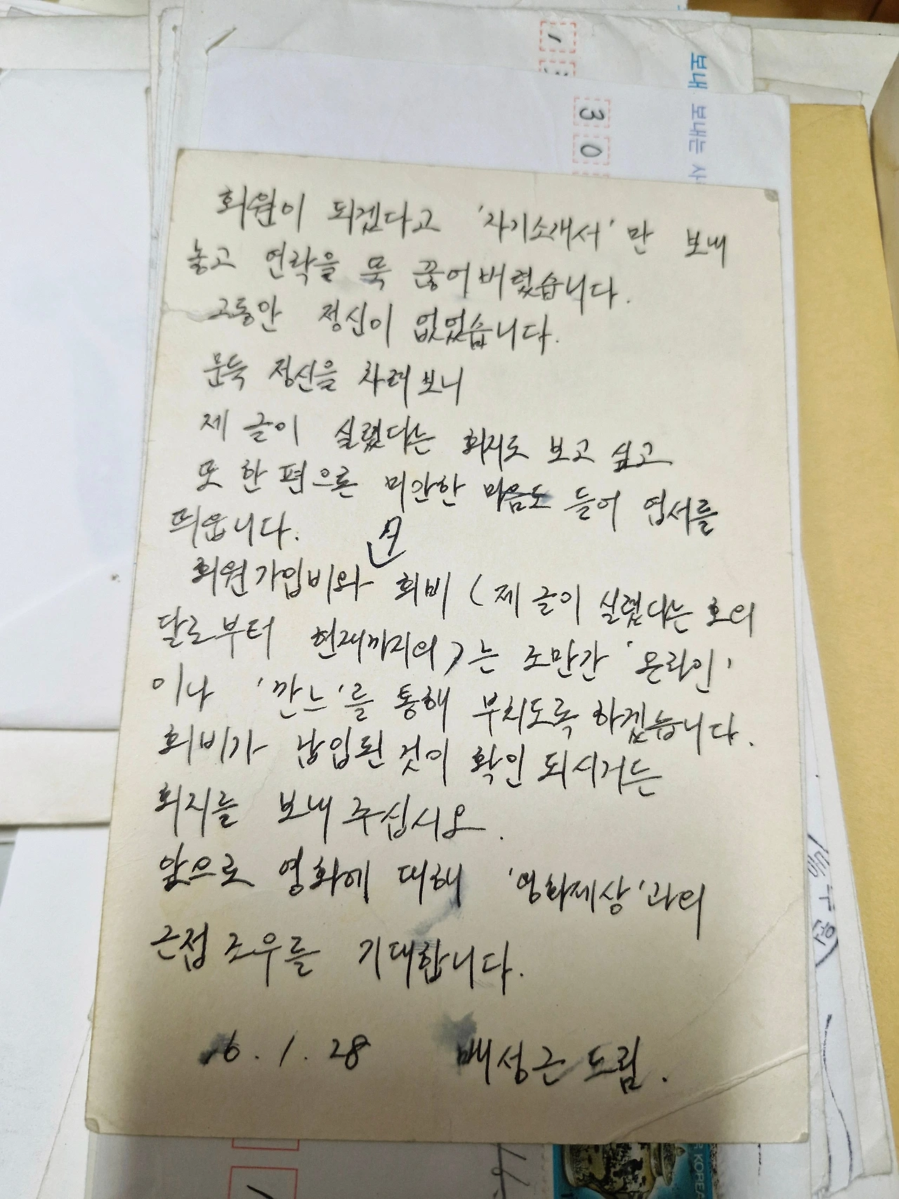 94년 10월에 신입회원이 되신 이종철 님은 카이스트 옆 에너지기술연구소에 다니시는 연구원이셔서 그런지 몰라도 디지털, HD TV 등 전문적인 원고도 여러 번 보내주셔서 회지에 실었습니다. 당시에는 잘 이해가 안 되었는데 지금 돌아보니 공학도로서 시대를 앞서기는 분이셨구나 라는 생각이 들었습니다. 그런데 지금도 조금 미안하게 생각하는 일이 있는데 합본호를 만들어서 그 두꺼운 책을 전달하고 팔러 갔었습니다. 이 종철 님의 아파트로 갔는데 당시 사모님과 어린아이도 있었는데 빈손으로 가서는 책값을 받는데 혈안이 돼서 다른 이야기는 듣는 둥 마는 둥 했던 기억이 남아있네요. 그때는 정말 죄송했습니다라고 말하고 싶습니다. 또 생각나는 일이 있습니다. 바로 회원의 어머니로부터 2월에 전화를 받은 것입니다. 00에 사는 고등학교에 다니는 여학생 회원의 어머니셨는데요. 전화를 받았는데 "공부하는 우리 딸 공부 방해되니까 그 영화세상 책 보내지 말아 달라. 앞으로 연락하지 않았으면 좋겠다"라고 말입니다. 그래서 연신 고개를 숙이고 "죄송합니다. 너무 죄송합니다"라고 사과를 했던 기억도 선명합니다.