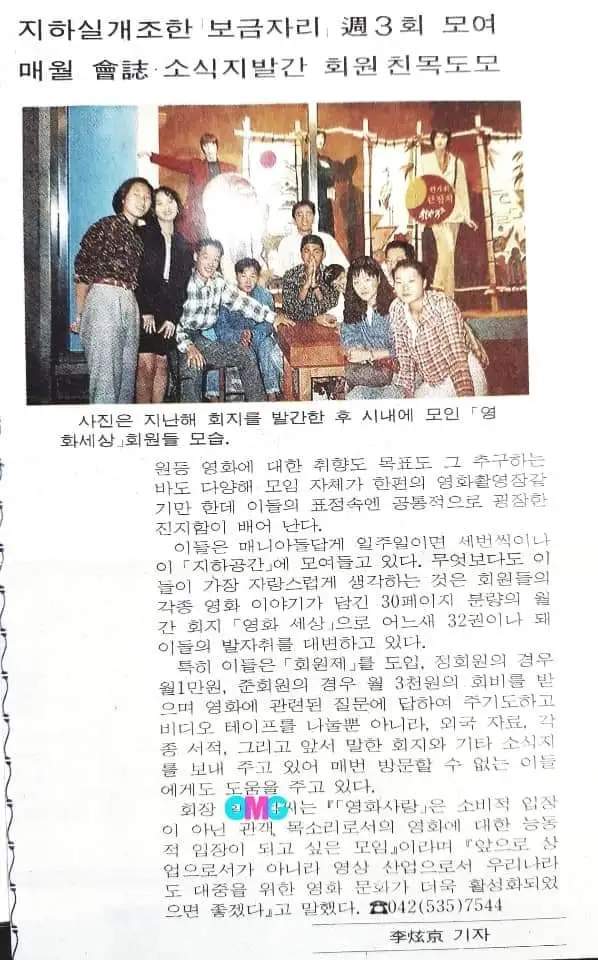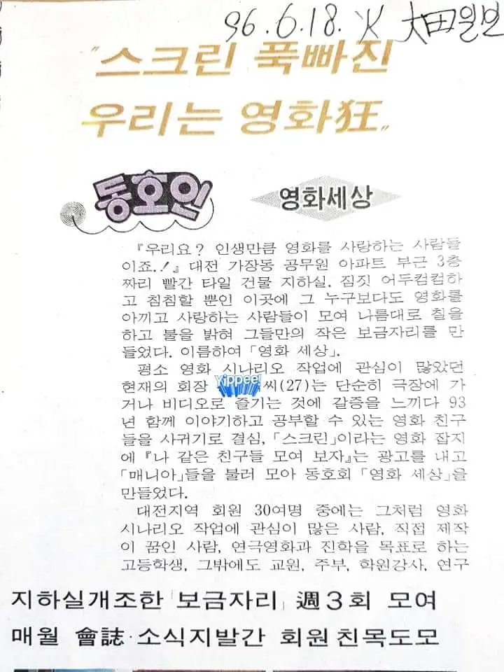 제가 써 놓았던 영화감상문은 프랑스 흑백 고전영화시리즈(죄와 벌, 전원 교향악, 무도회의 수첩)를 끝낸 저는 황규석 영화일기라는 코너로 영화감상문을 올렸습니다. 회원 중에 서울에 사는 한성수라는 친구는 만나 보니 수줍음을 많이 타는 친구인데 영화도 많이 보고 글 솜씨도 좋아서 늘 원고 청탁 삐삐를 치고 서울에서 대전에서 자주 만나는 친구였습니다. 자기소개서를 보면 지금처럼 개인 정보에 대한 기준이 미흡하고 아직 인터넷이 대중화되기 전이라 개인의 주민번호도 올리는 것도 왕왕 보게 됩니다. 노래를 잘하고 키도 적고 언니의 소개로 동생이 친구의 소개로 또 우리 영화세상의 가족이 되기도 했습니다. 회원의 영화이야기, 그리고 신입회원들이 자신의 영화 취향을 밝히고 성격과 재미있는 이야기를 풀어놓는 코너도 인기가 있었으리라 생각합니다. 13호(94년 10월)부터 24호(95년 9월) 중에는 제가 사는 대전 지역의 회원이 많이 늘었는데 그 이유가 있었습니다. 당시 무료 정보지가 유행이었는데요. 94년 2월부터 그 유명한 교차로와 벼룩시장, 대전의 중앙로에도 유료로 짧은 몇 줄이지만 광고 접수를 했기 때문이었습니다. 많은 회원들이 와야 더 많은 회비를 모으고 안정적으로 회지를 제작할 수 있겠다고 생각했습니다. 그리고 서서히 모임의 공간을 만들었으면 좋겠다. 그것이 사무실이든 감상공간이든 전용 아지트가 있으면 좋겠다는 바람을 가지게 되었습니다.