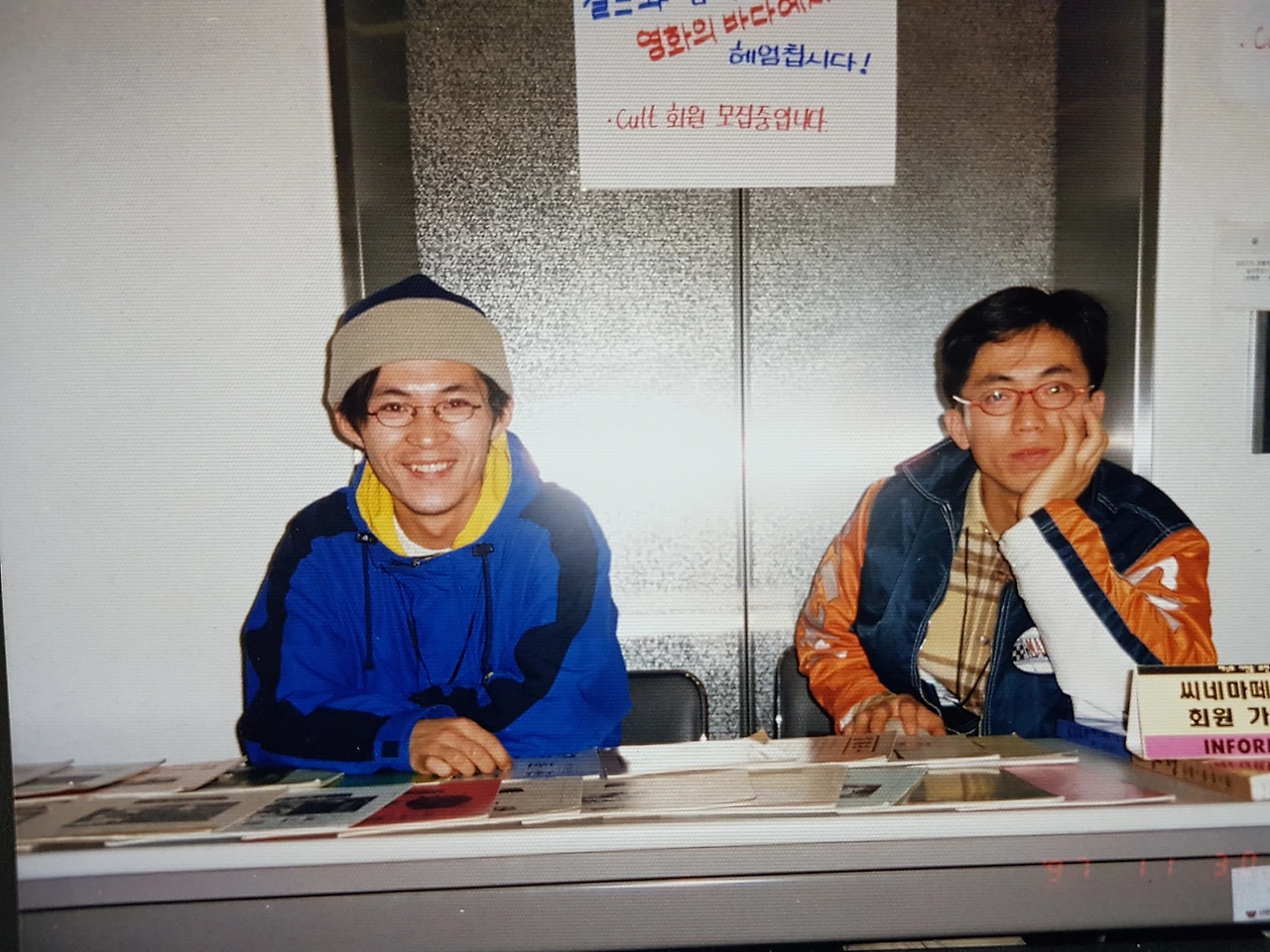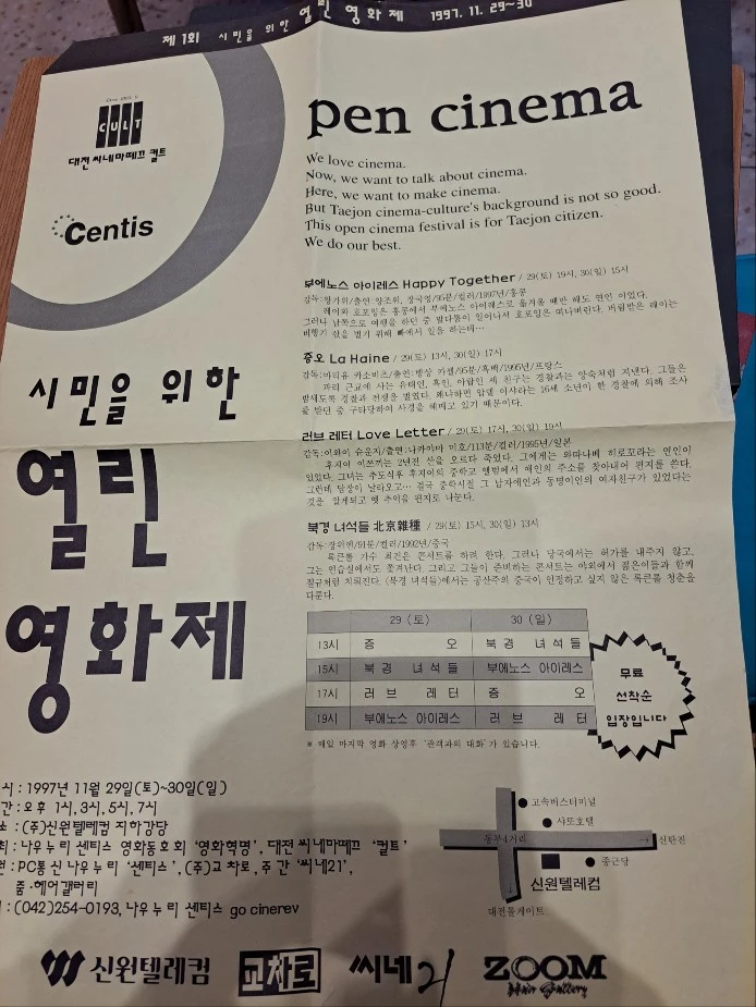 일종의 후원 개념이랄까요. 상영작은 왕가의 감독의 '해피투게더'(춘광사설), 이와이 슌지 감독의 '러브 레터', 장 위엔 감독의 '북경 녀석들', 마티유 카소비츠 감독의 '증오' 이렇게 네 작품을 토의 끝에 골랐습니다. 그때 운영위원으로 는 배재대에서 영화를 전공한 통영 출신의 정용진 친구도 최정호 친구와 함께 많은 일을 도와주었습니다. 상영장소가 문제였습니다. 그리고 섭외 끝에 신원텔레컴 지하 강당을 장소로 정했습니다. 영화에 대한 소개는 영화를 기획한 정용진과 제가 쓴 글로 대신했습니다. 그리고 그때 2번째로 대전의 영상문화에 대한 설문조사를 진행했습니다. 설문지는 나눠드리고 입구에서 회지는 2천 원에 판매를 했습니다. 포스터를 만들어서 외부에 회원들이 붙이러 다녔습니다. 젊은이들이 많이 모이는 서점과 극장가에 붙였습니다. 그리고 PC통신을 통한 홍보에도 노력을 했습니다.