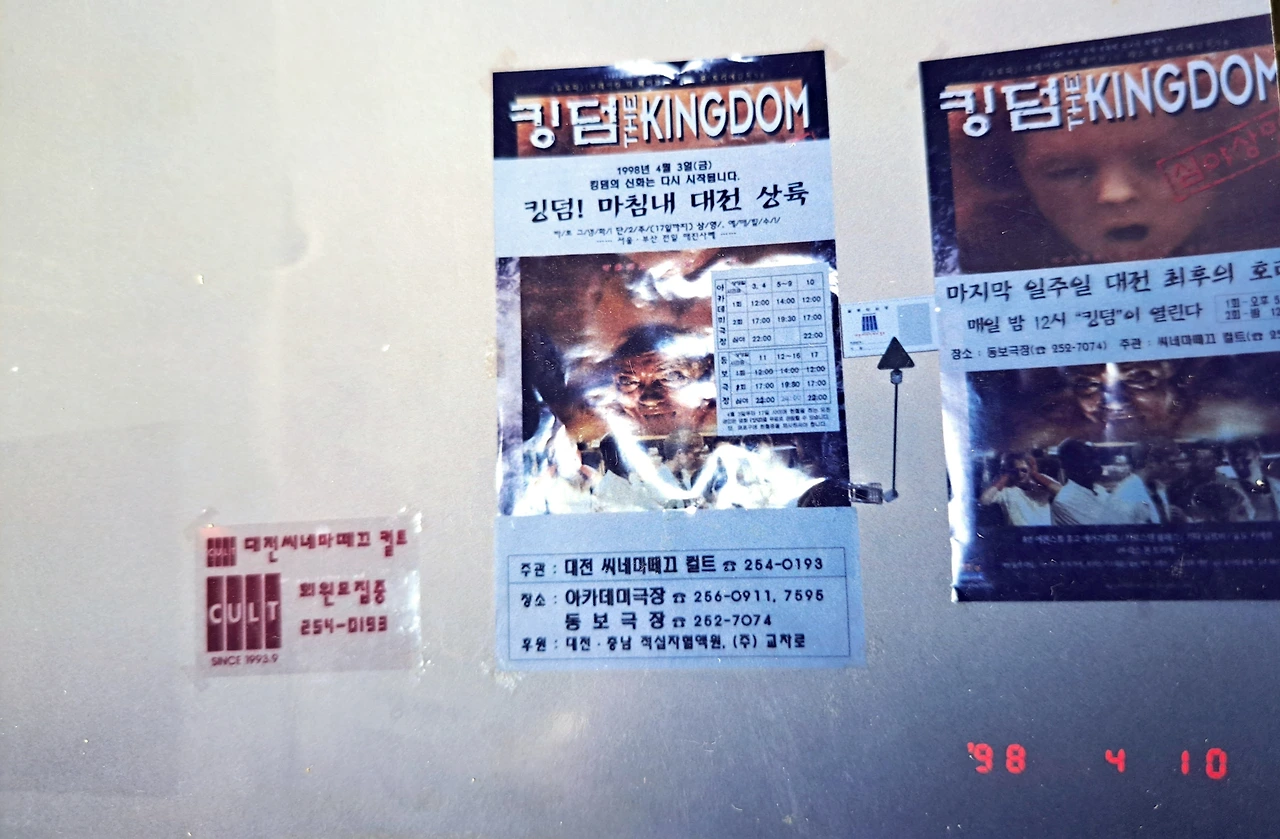 그리고 1998년 5월에 드디어 공식적인 대전 시네마테크 컬트의 마지막 회지인 제51호 회지가 나오게 되었습니다. 2월 이후 또 3개월의 시간이 지나서 나왔는데 이제 매달 나와야 한다는 부담감도 두 번 늦게 나오니 사라졌습니다. 충실한 내용을 채우면 되다는 생각으로 바뀌게 된 것입니다. 그렇지만 시민을 위한 열린 영화제로 힘을 빼서 충전의 시간이 필요했습니다. 그러면서 준비한 것이 바로 '킹덤'의 대전 상영입니다. 이 영화는 라스폰 트리에와 모르텐 안프레드 감독의 영화로 1997년 제1회 부천 국제영화제의 화제작으로 영화제에 참가하여 직접 보았는데 4시간 39분의 러닝타임 동안 정말 손에 땀을 쥐게 만든 영화였습니다. 이 영화가 대구에서 상영을 하고 관객의 호응을 얻는다고 해서 우리도 시도를 해보고 싶었습니다. 그래서 당시 부산에서 올라와 대전에서 살며 컬트의 운영위원이었던 최아휘, 정용진, 김요석 친구들과 함께 기획을 하였습니다. 그리고 대전 최초의 밤 12시 심야 상영이었습니다.