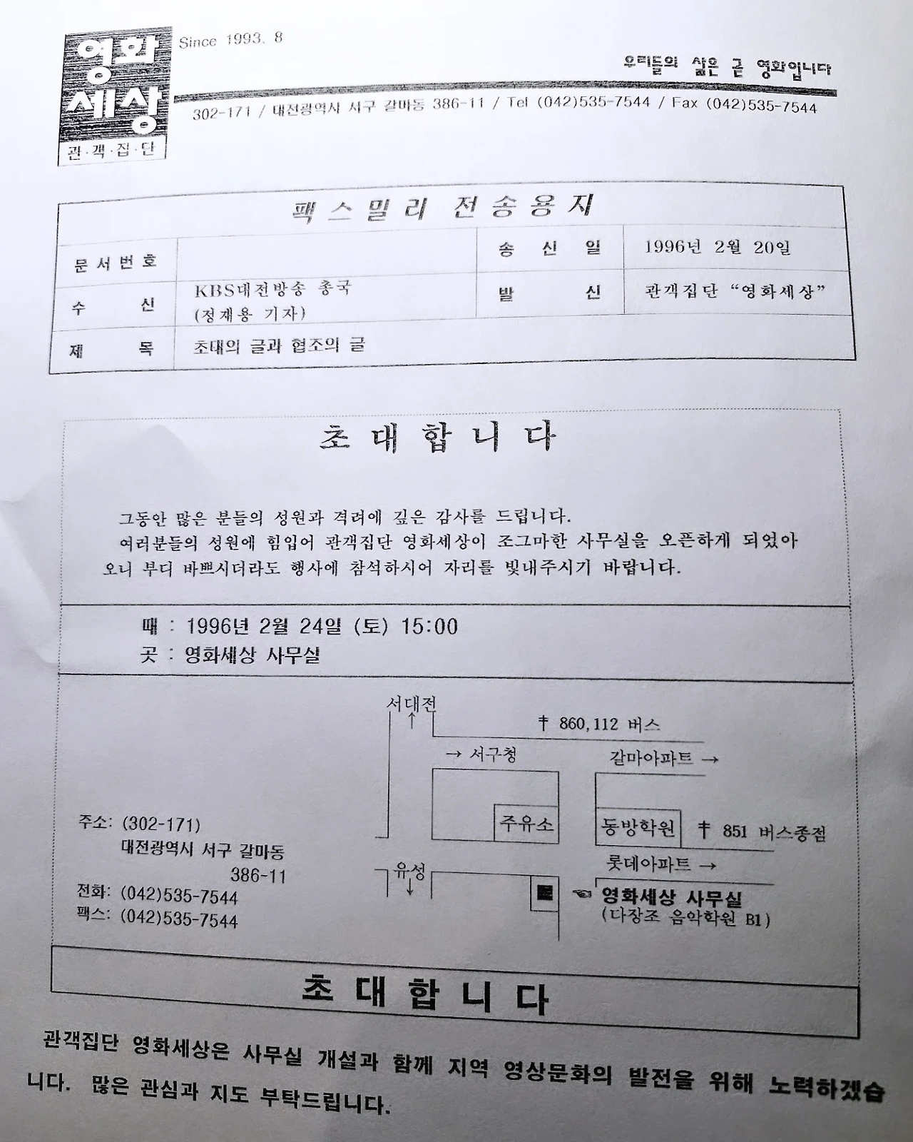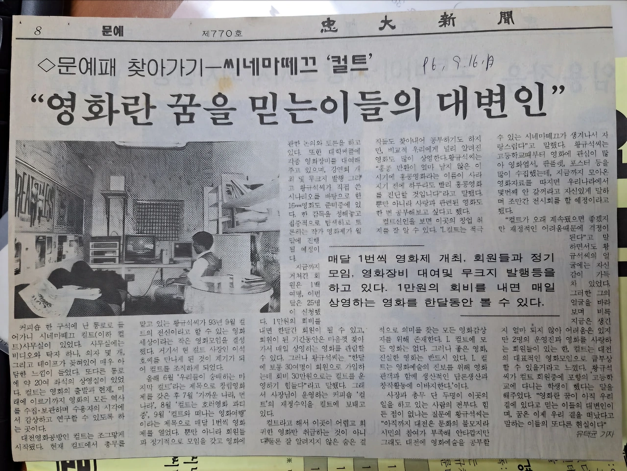 선화동 교보빌딩 옆 지하에 있다가 몇 개월 못 있고 1997년 1월 새해에 컬트에 오신 이석호 사장님께서 가게를 정리하고 완전히 대전을 떠나 천안으로 가신다고 했을 때 가장 고민이 되었습니다. 우리 컬트도 빠지고 세를 주었던 옆의 커피숍 겸 호프집도 빼기로 했습니다. 원래 지하를 통으로 전세 내셔서 반으로 그 나눈 공간이었거든요. 가을에 제가 전담하여 운영을 맡은 관리자로 들어왔을 때는 시사실이 있다는 컬트를 운영한다는 자부심과 자랑이 있었습니다. 그런데 그 기쁨도 잠깐이고 이제 새로운 공간을 빌려 독립을 해야 한다는 숙제가 생긴 것입니다. 1997년 1월 초 신정 연휴에 그 이야기를 들어서 새해 벽두부터 어깨가 무거워졌습니다. 당장 짐을 뺄 곳을 알아보러 다녔습니다. 그 와중에 지방에서 온 손님들을 모시고 시네마테크 연합을 위한 준비 회의를 가졌습니다. 회의 후 당장 짐을 뺄 곳을 알아보러 다녔습니다. 근데 1월 21일 차가웠던 화요일 오후 어떤 전화를 받게 됩니다. 컬트를 신문에서 봤는데 뭐 하는 곳이냐고 하더라고요. 말투가 품위가 있었습니다. 문화에 대한 이해심이 있는 분인 것 같더라고요. 그래서 이래 저래 설명을 했습니다. 그리고 혹시나 해서 이제 이런 좋은 공간도 비워줘야 하고 나가야 한다고 걱정을 또 흘렸습니다. 그랬더니 글쎄 그분이 자기가 작은 5층짜리 건물이 있는데 5층이 20평짜리가 비었는데 거기가 어떤지 모르겠다고 하셨습니다. 그야말로 광명이 비추는 순간이었습니다. 할렐루야! 심봤다 속으로 환호를 질렀습니다. 그때 쓰던 공간이 13평 정도였는데 20평 공간을 그것도 무상으로 빌려준다니...