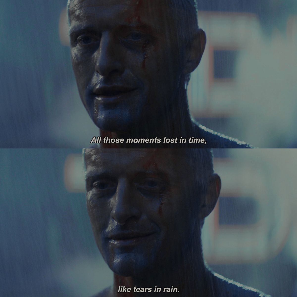 인간보다 더 용감하고 인간보다 더 정이 많은 두 합성인간 킬러 즉 사냥꾼과의 만남은 그래서 더욱 극적이다. 그리고 손을 내밀어 인간을 살리고 자신의 최후를 맞이하는 안드로이드. 그가 흘린 눈물은 곧 '살고 싶다'는 애원과 절망의 눈물이다. 동시에 강한 인간애와 그 인간의 욕망에 대한 질타의 회초리다.