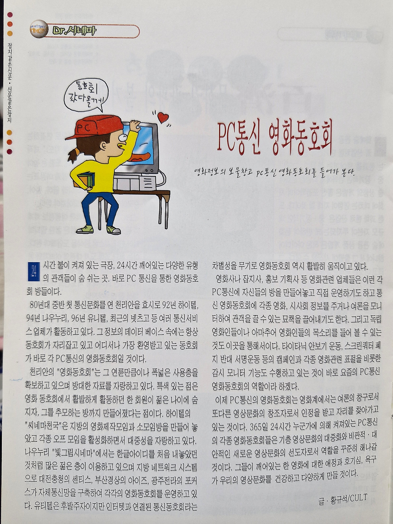 24시간 불이 켜져 있는 극장, 24시간 다양한 유형의 관객들이 숨 쉬는 곳, 바로 PC통신을 통한 영화동호회 방들이다. 80년대 중반 첫 통신문화를 연 천리안을 효시로 92년 하이텔, 94년 나우누리, 96년 유니텔, 최근의 넷츠고 등 여러 통신서비스업체가 활동하고 있다. 그 정보의 데이터 베이스 속에는 항상 영화동호회가 자리 잡고 있고 어디서나 가장 환영받고 있는 동호회가 바로 PC통신의 영화동호회일 것이다.