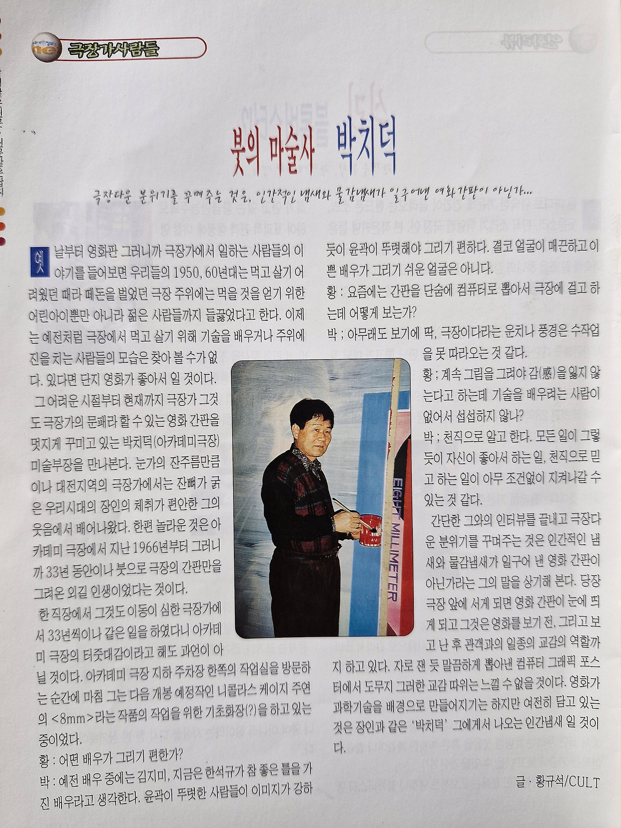 간단한 그와의 인터뷰를 끝내고 극장다운 분위기를 꾸며주는 것은 인간적인 냄새와 물감냄새가 일구어낸 영화 간판이 아닌가라는 그의 말을 상기해 본다. 당장 극장 앞에 서게 되면 영화 간판이 눈에 띄게 되고 그것