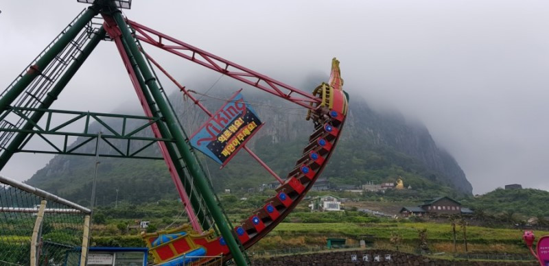 보슬비에 아랑곳 없이 놀이기구가 하늘을 찌른다.