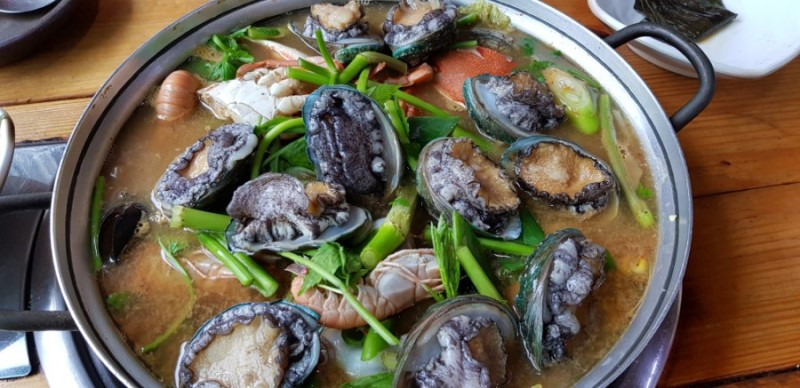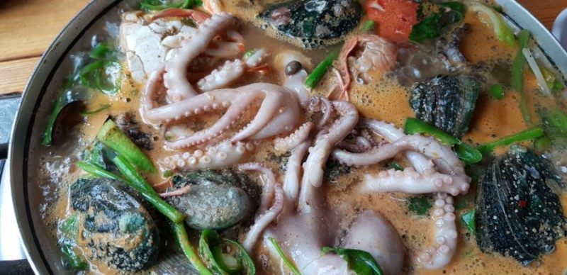 전복, 낚지, 홍합, 조개, 딱새우, 미더덕 등 해물과 콩나물, 어린 배추가 어우러져 국물 맛이 정말 시원하다.