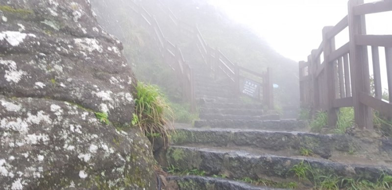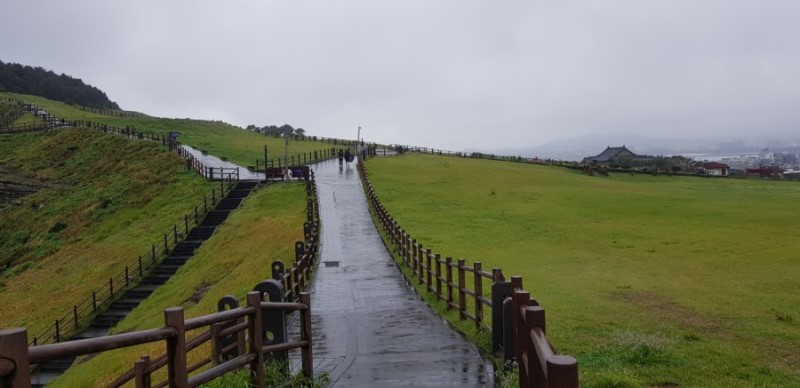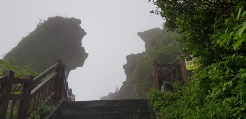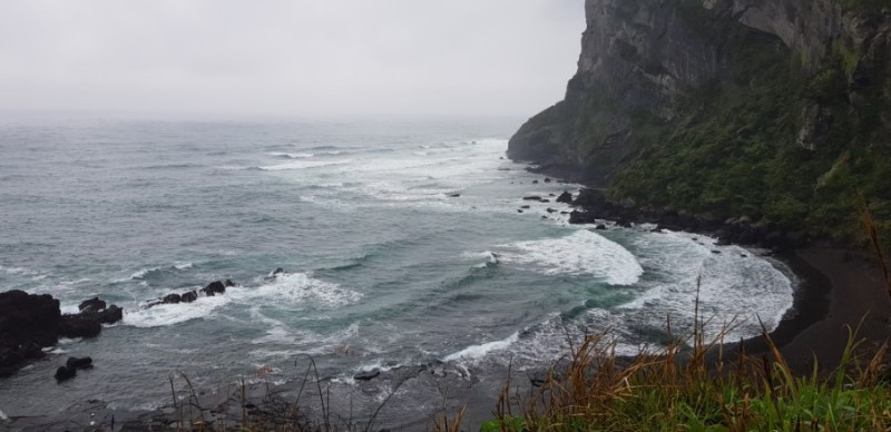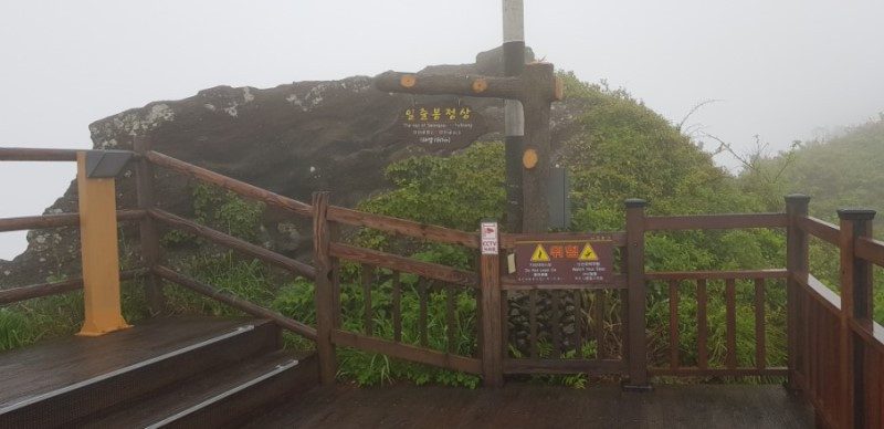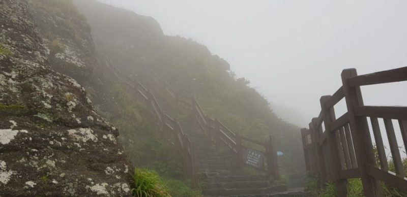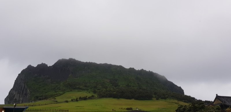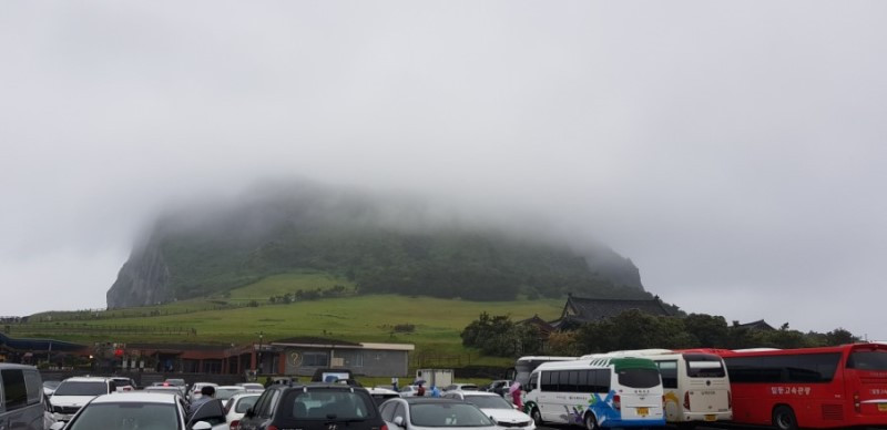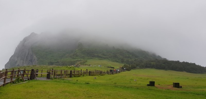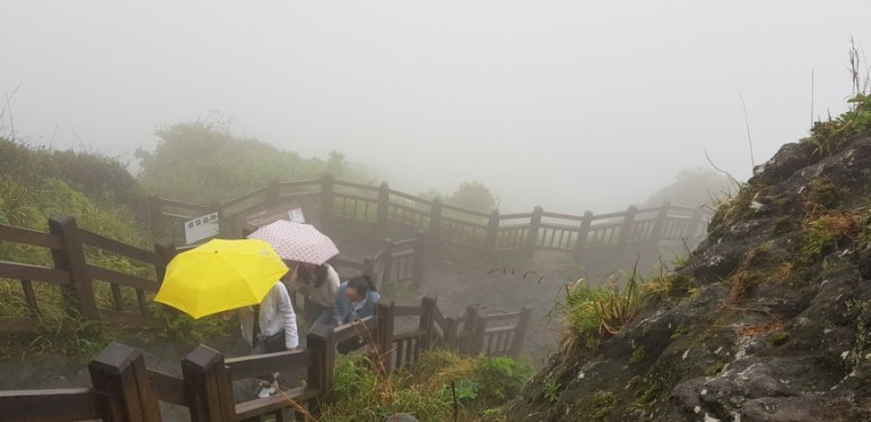 일출봉을 오를수록 시야는 구름 속을 헤맨다.