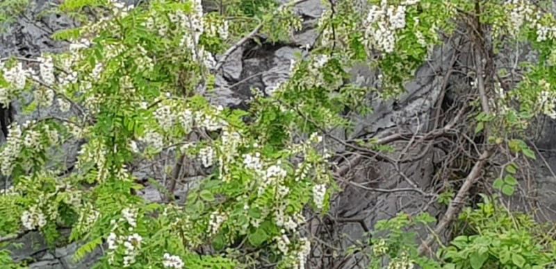 하천 절벽의 아카시아꽃이 옛 향수를 불러일으킨다.