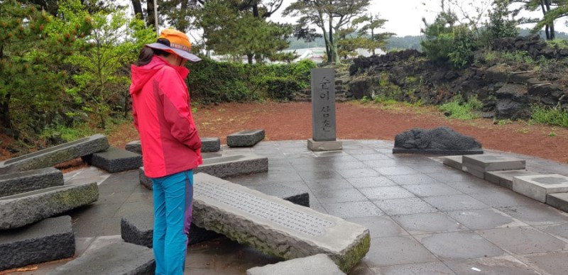 위령비가 보슬비를 맞으며 쓸쓸히 서 있다.
