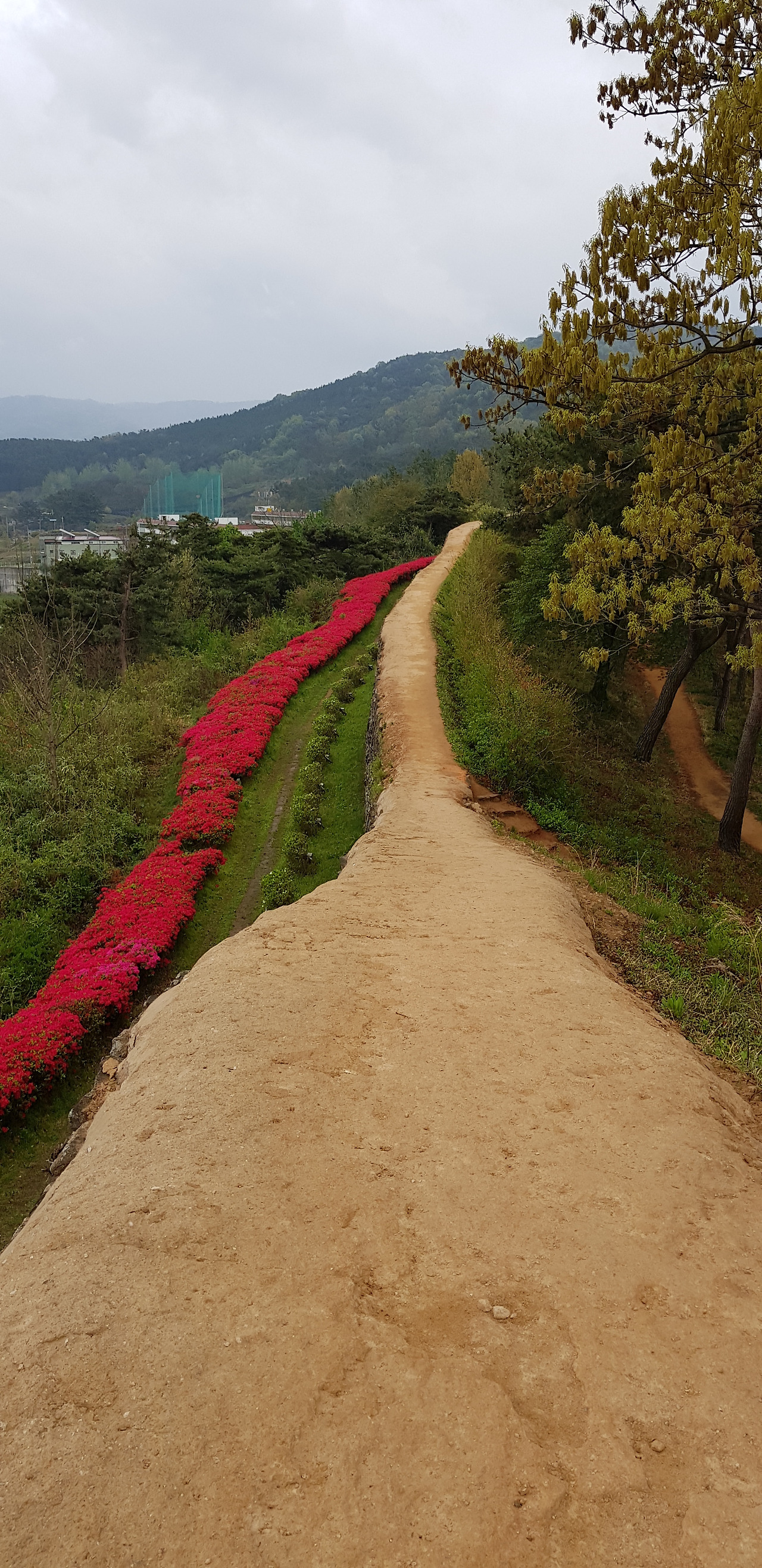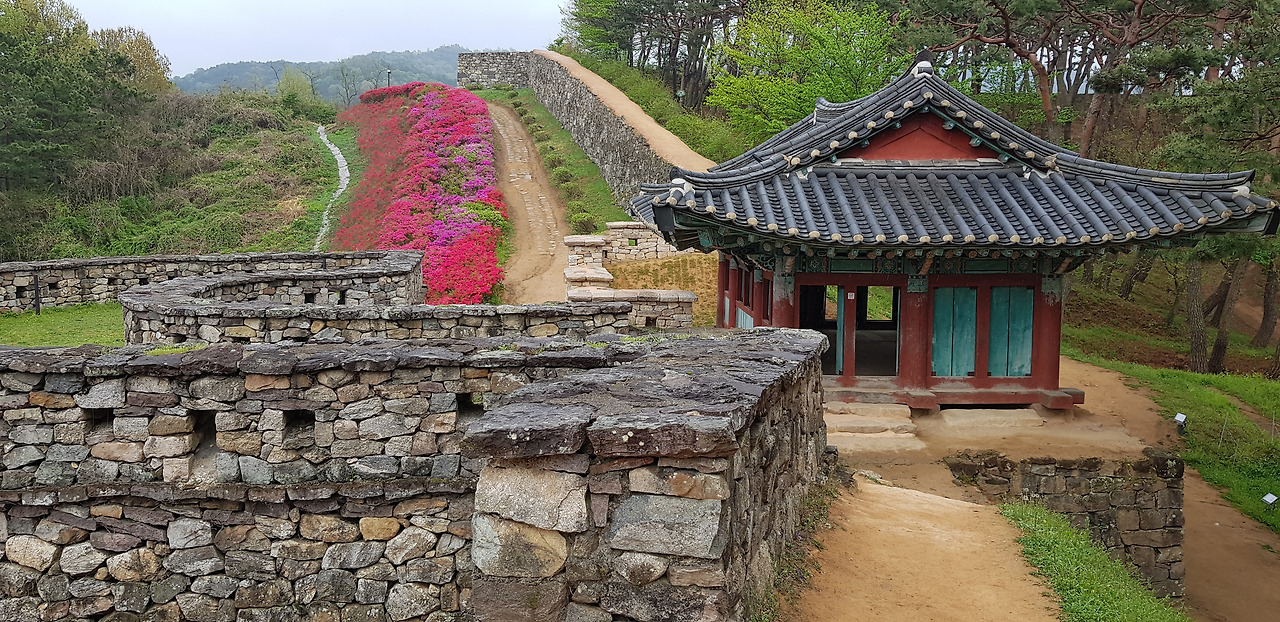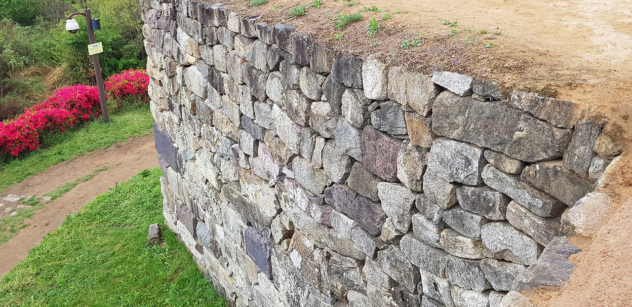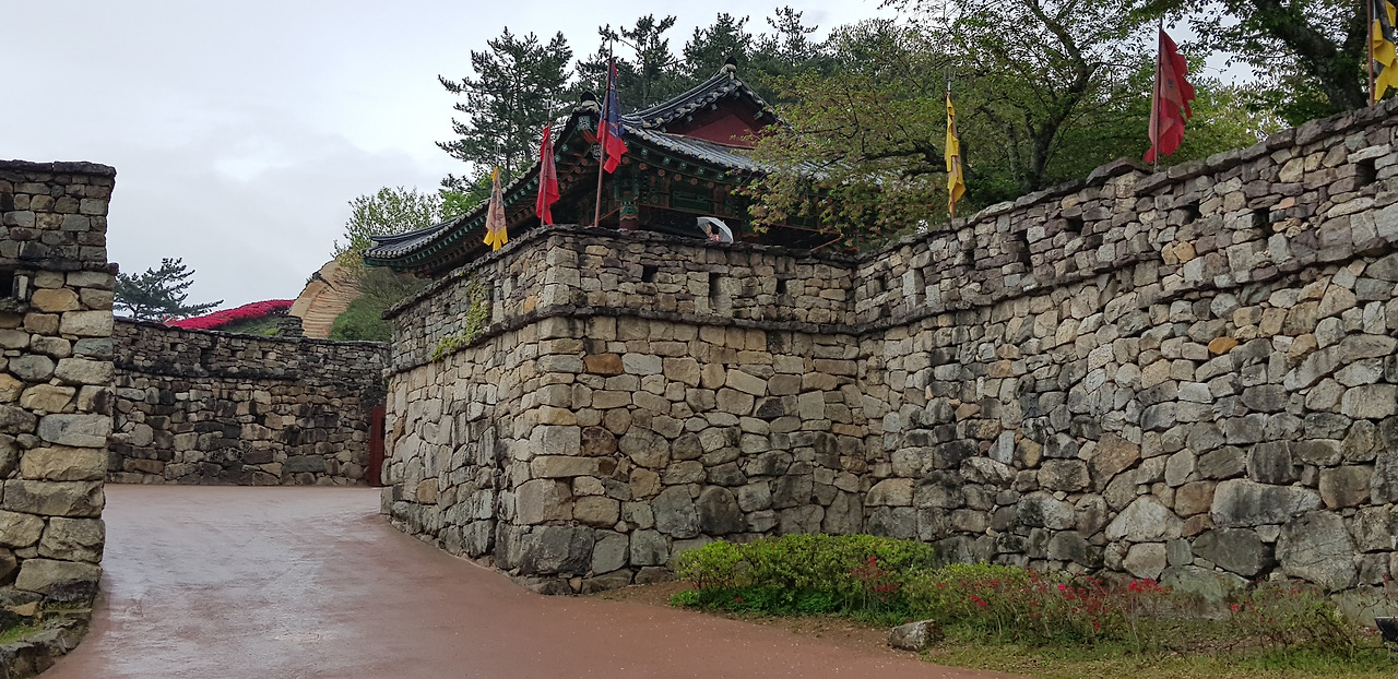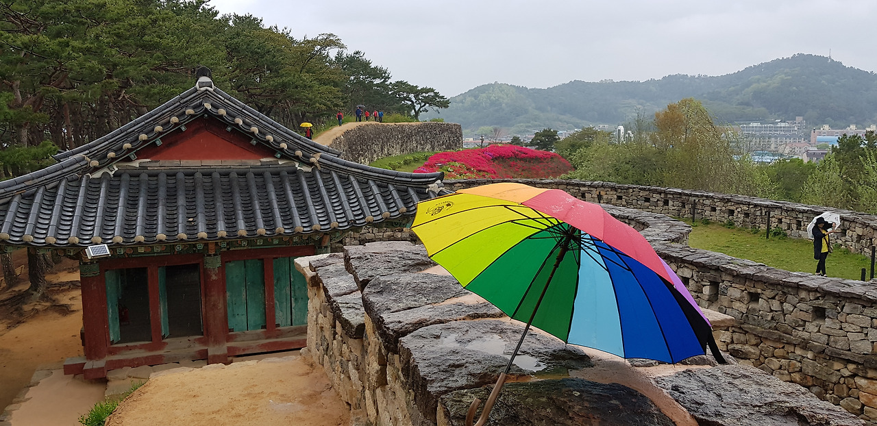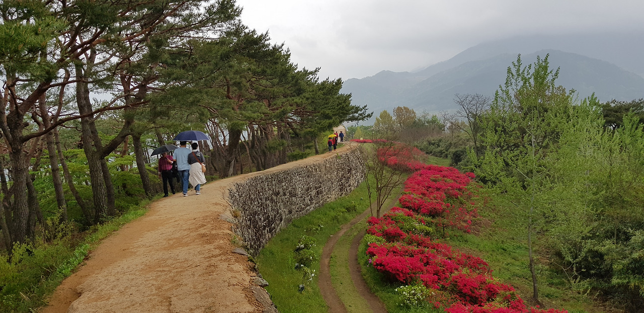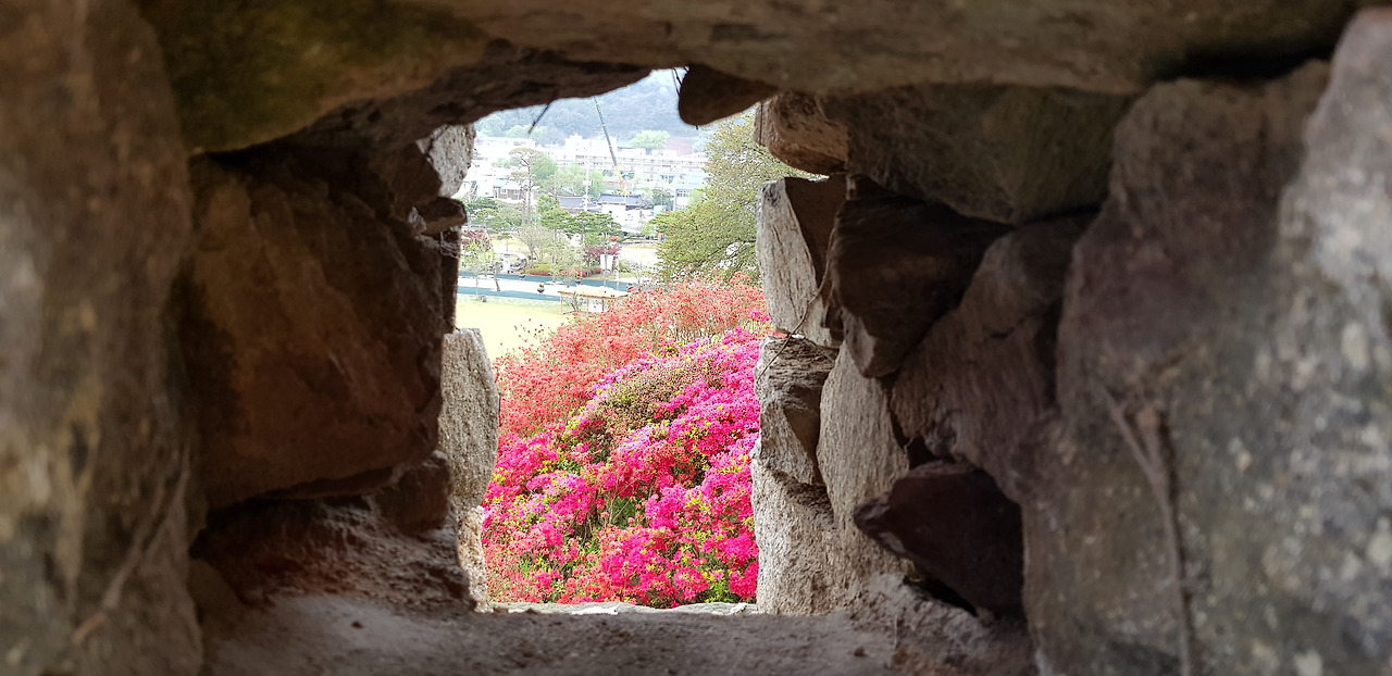 겹겹히 쌓인 성곽의 수많은 돌들... 성을 쌓으며 겪었을 민초들의 한들이 켜켜이 쌓아올린 돌처럼 억눌려왔다. 기분 전환을 위해 돌 구멍을 내다봤다. 주홍빛 철쭉꽃이 간간히 내리는 빗물에 젖어 더욱 선명하다.
