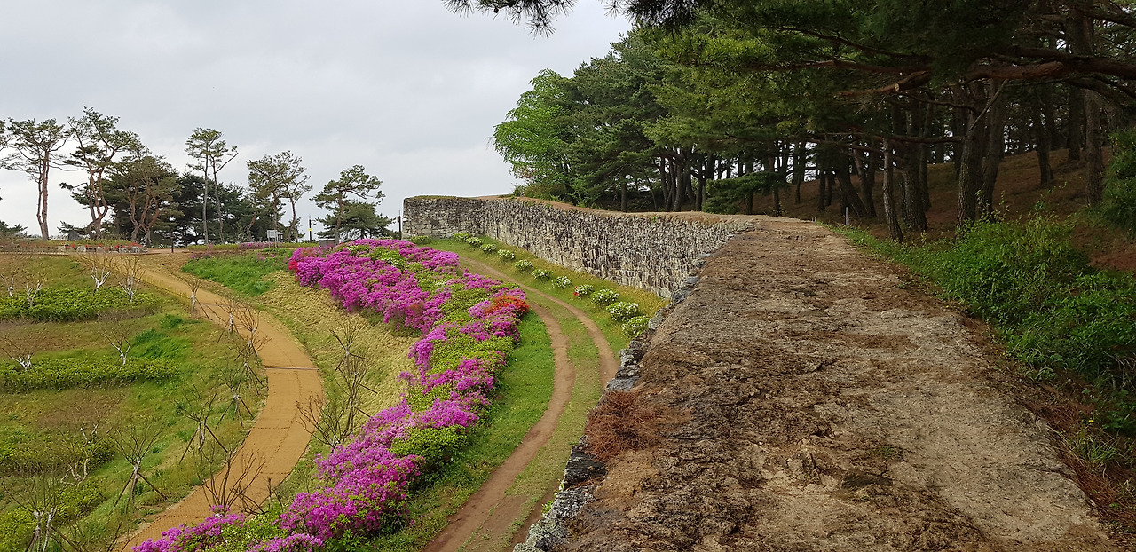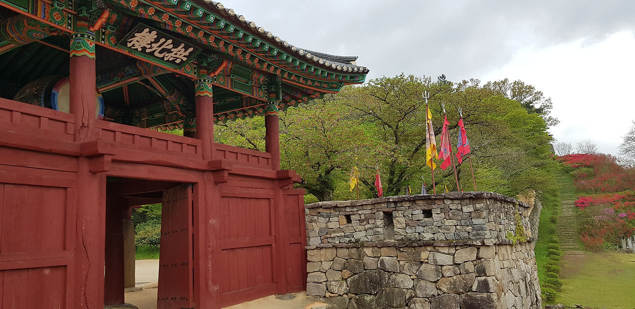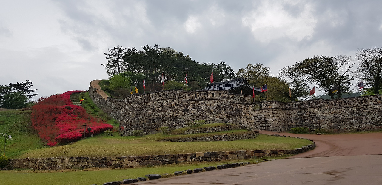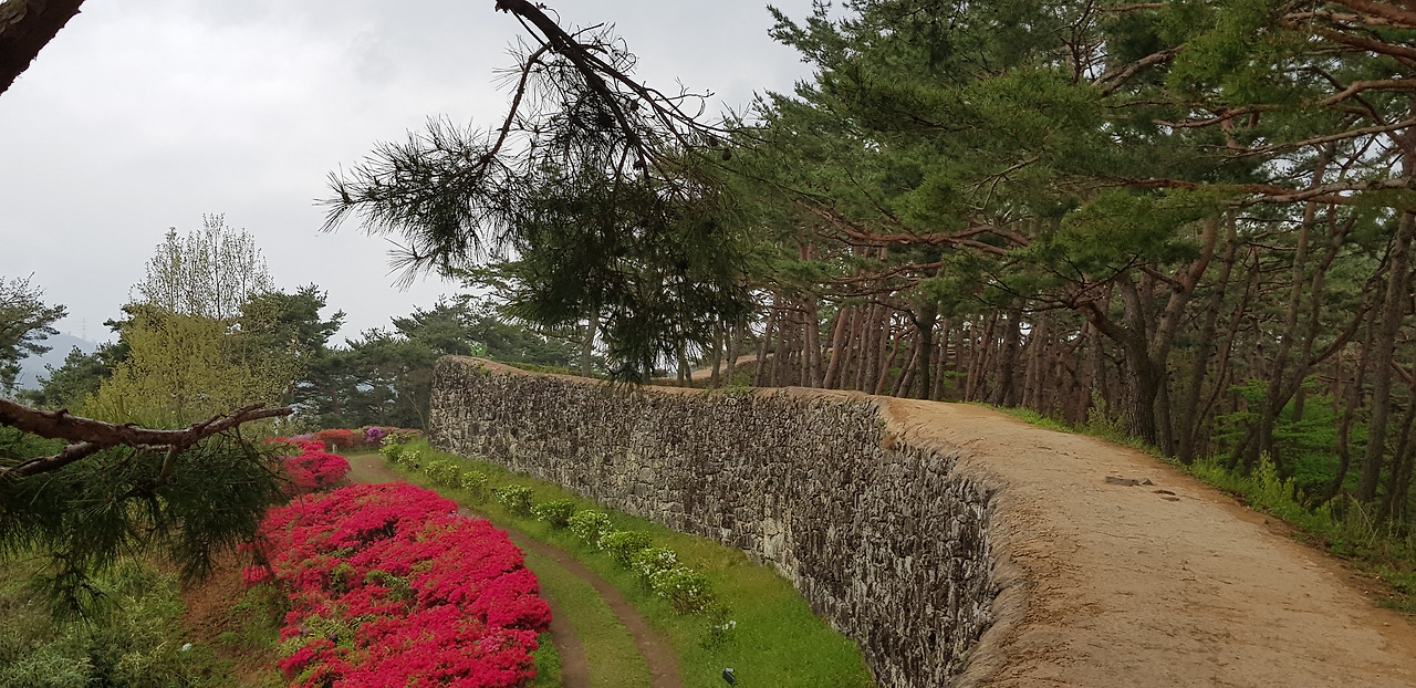 좁은 읍성길을 걸으며 마주하는 성밖과 성안의 풍경이 평화롭기 그지없다. 커다란 돌로 한 땀 한 땀 쌓아 올린 성벽과 산책로를 수놓은 하얀, 분홍, 주홍빛 철쭉이 유난히 화려했다. 동문인 등양루와 서문인 진서루를 거쳐 어느덧 출발지인 공북루가 나타났다. 공북루 성곽에 걸친 깃발이 당시의 병사를 부르듯 비바람에 흔들거렸다.