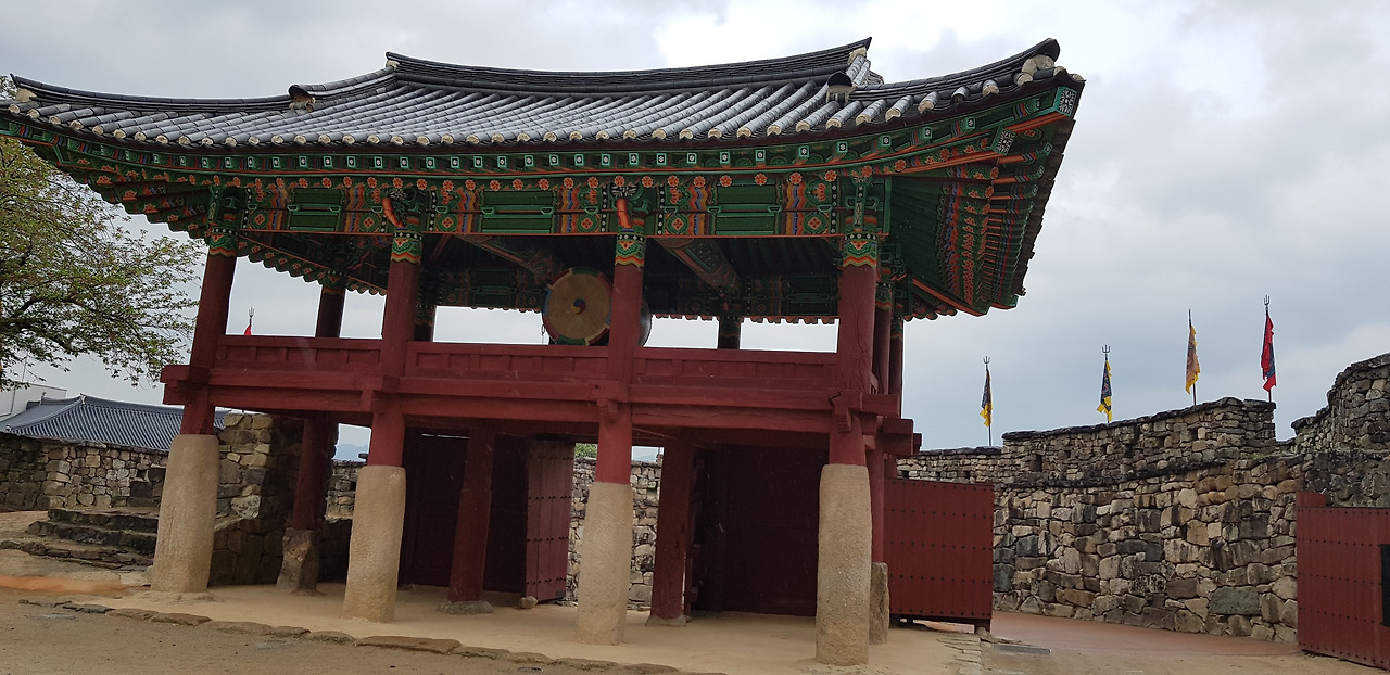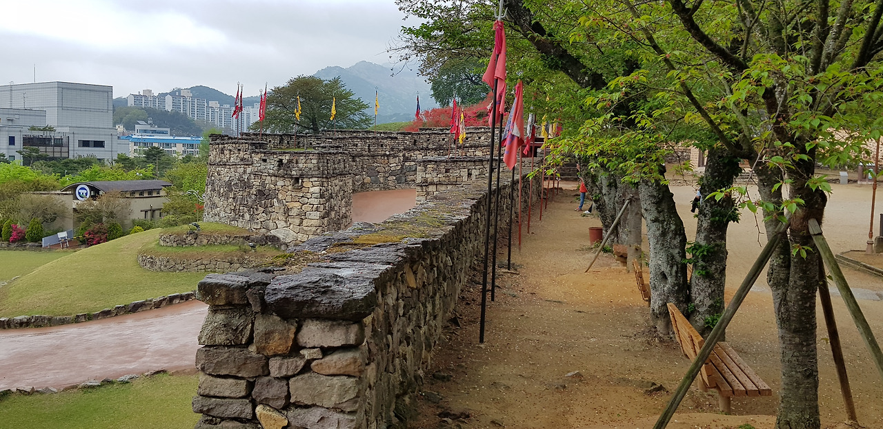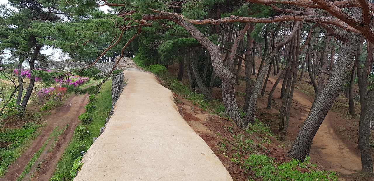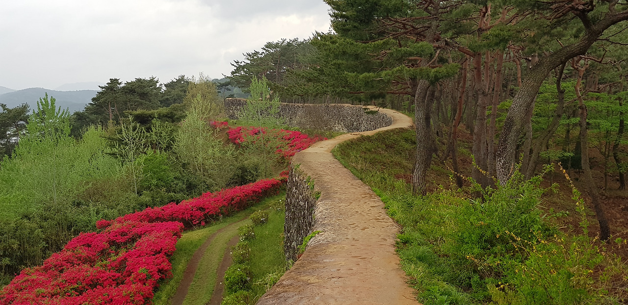 좁은 읍성길을 걸으며 마주하는 성밖과 성안의 풍경이 평화롭기 그지없다. 커다란 돌로 한 땀 한 땀 쌓아 올린 성벽과 산책로를 수놓은 하얀, 분홍, 주홍빛 철쭉이 유난히 화려했다. 동문인 등양루와 서문인 진서루를 거쳐 어느덧 출발지인 공북루가 나타났다. 공북루 성곽에 걸친 깃발이 당시의 병사를 부르듯 비바람에 흔들거렸다.