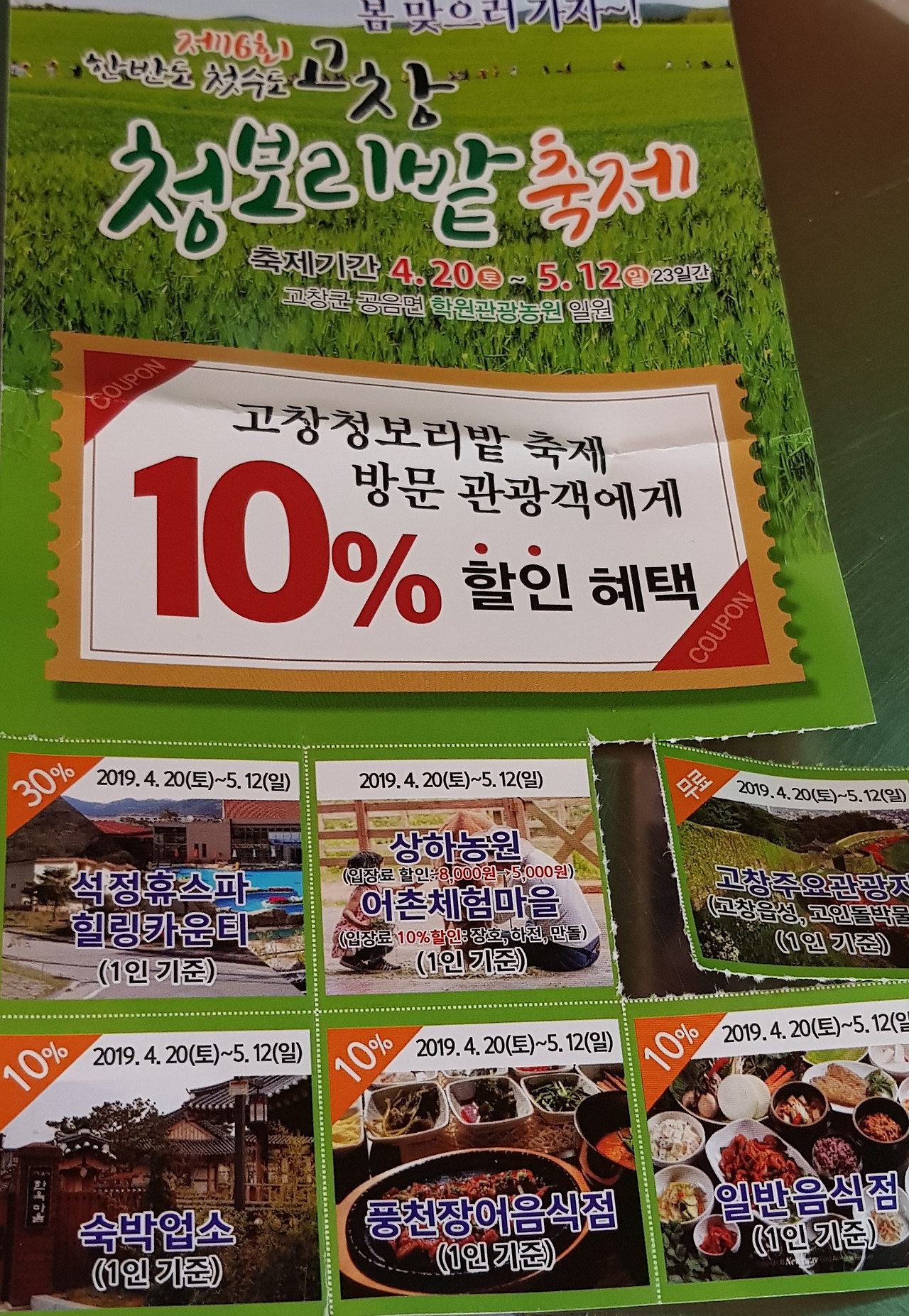 그래서 마침 청보리밭 축제장에서 준 숙박업소, 식당, 관광지 할인 팸플릿 보여주니 관광지 무료 티켓만 떼어간다. 몇 푼 안 되지만 공짜 입장이라 왠지 로또 맞은 기분이다. 오늘 계 탔다~