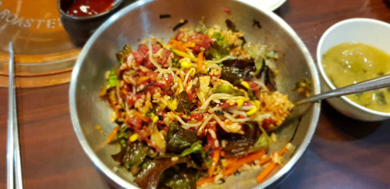 혼밥이라 고기는 못 구고 육회 비빔밥을 시켰다. 그런데 고기양이 장난이 아니다. 특으로 주문해서 그런가? 거짓말 조금 보태서 밥 반 고기 반이다.