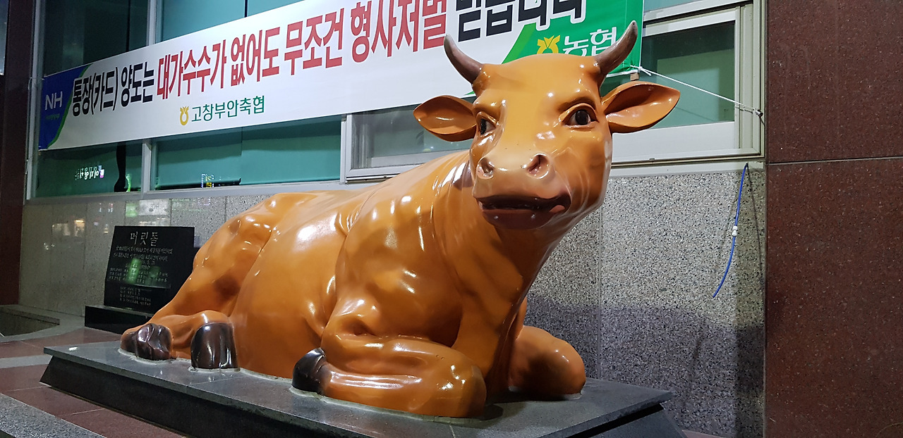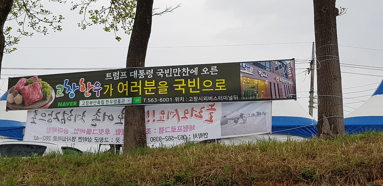 고창이 한우로 유명하다 해서 찾았다. 주차장에서 걸어서 1km 떨어진 한우명품관이다. 트럼프 대통령이 왔을 때도 만찬으로 여기 것은 썼단다. 플래카드까지 걸렸다.