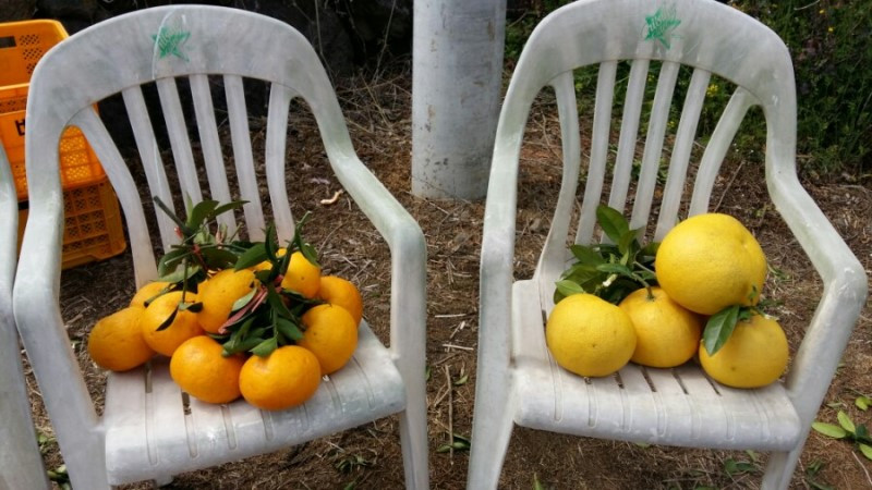 오다 보니 7코스 종점인 월평마을 아왜낭목을 지나쳤다. 길에 전시된 하귤의 크기가 다양하다. 오른쪽 하귤은 어른 주먹 두 배 사이즈다. 엄청 크다.