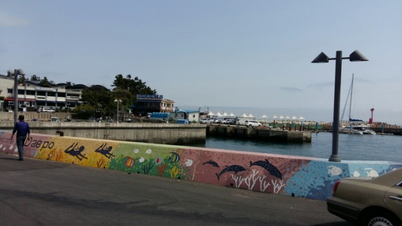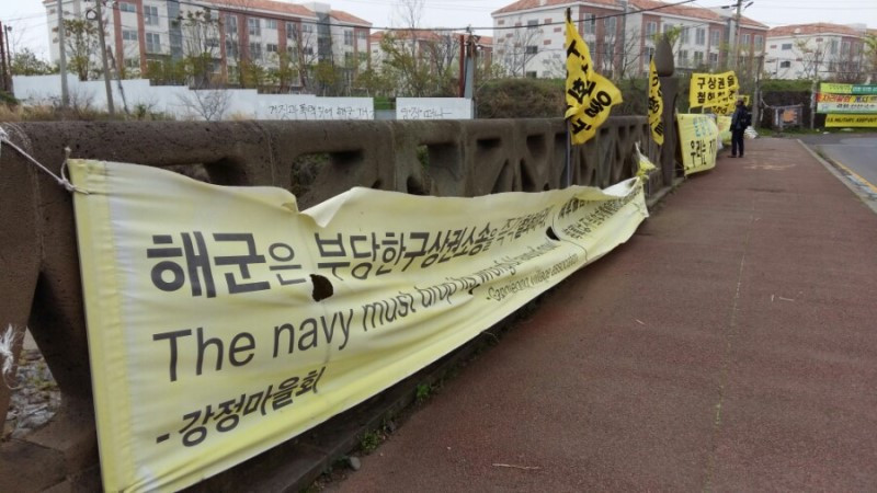 2007년부터 시작된 용과 독수리의 싸움. 2013년 3월까지 6년 동안 주민과 평화 활동가들은 5억 원이 넘는 벌금형에 지금도 진행형이라고... 연인원 670여 명이 연행되고 구속•수감된 사람이 20여 명에 이르며 지금도 수감 중인 사람이 있다. 그렇게 해군기지는 결국 2016. 2월에 완공되었다. 그래서 올레길도 구럼비가 있었던 바닷가로 가지 못하고 해군기지를 빙 돌아 우회해야 한다. 해군기지와 강정 포구 사이에는 기지 진입을 위한 도로 건설과 크루즈항 설치공사가 한창 진행 중이어서 시끄러웠다.